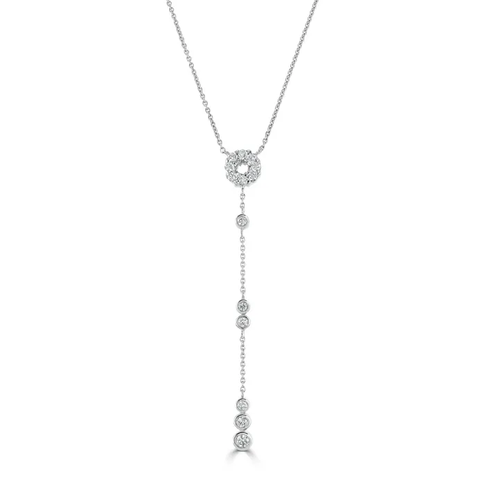Unveil the sheer elegance of our 18ct white gold pendant, featuring a striking design that combines contemporary flair with timeless beauty. This exquisite piece showcases an open circle of round brilliant cut diamonds, followed by an artful arrangement of a solitaire, a pair, and a set of three diamonds cascading below. Each diamond is meticulously rubover set, enhancing their brilliance and ensuring a smooth, refined finish. The total diamond weight is 0.50 carats, promising exceptional sparkle and allure. This pendant gracefully hangs from a 16-inch 18ct white gold trace chain, providing a secure and stylish fit that complements any neckline. Perfect for special occasions or as a standout addition to everyday wear, this pendant is a luxurious choice for anyone seeking to elevate their jewellery collection.