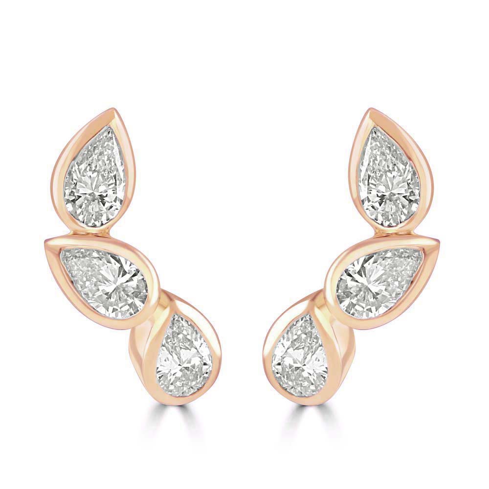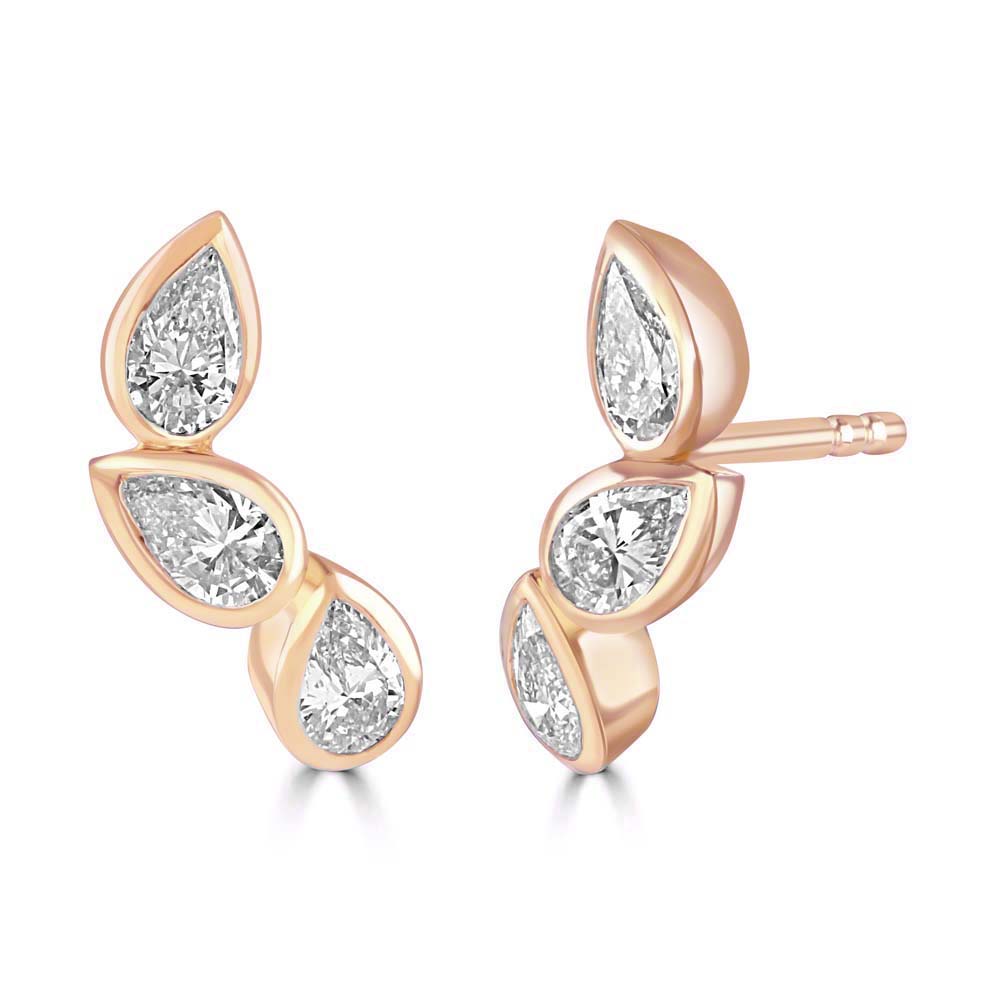 Add a touch of sophistication to your jewellery collection with these stunning 18ct rose gold drop stud earrings. Each earring features three rubover set pear-cut diamonds, beautifully arranged to catch the light and enhance their natural brilliance. The warm hue of the rose gold complements the sparkle of the diamonds, creating a timeless and elegant look. These earrings are designed with post and butterfly fittings, ensuring a secure and comfortable fit. With a total diamond weight of 0.86ct and diamonds of F/G colour and VS-SI clarity, these earrings combine modern design with classic luxury. Perfect for special occasions or as a cherished gift, they will add a touch of refined elegance to any ensemble.