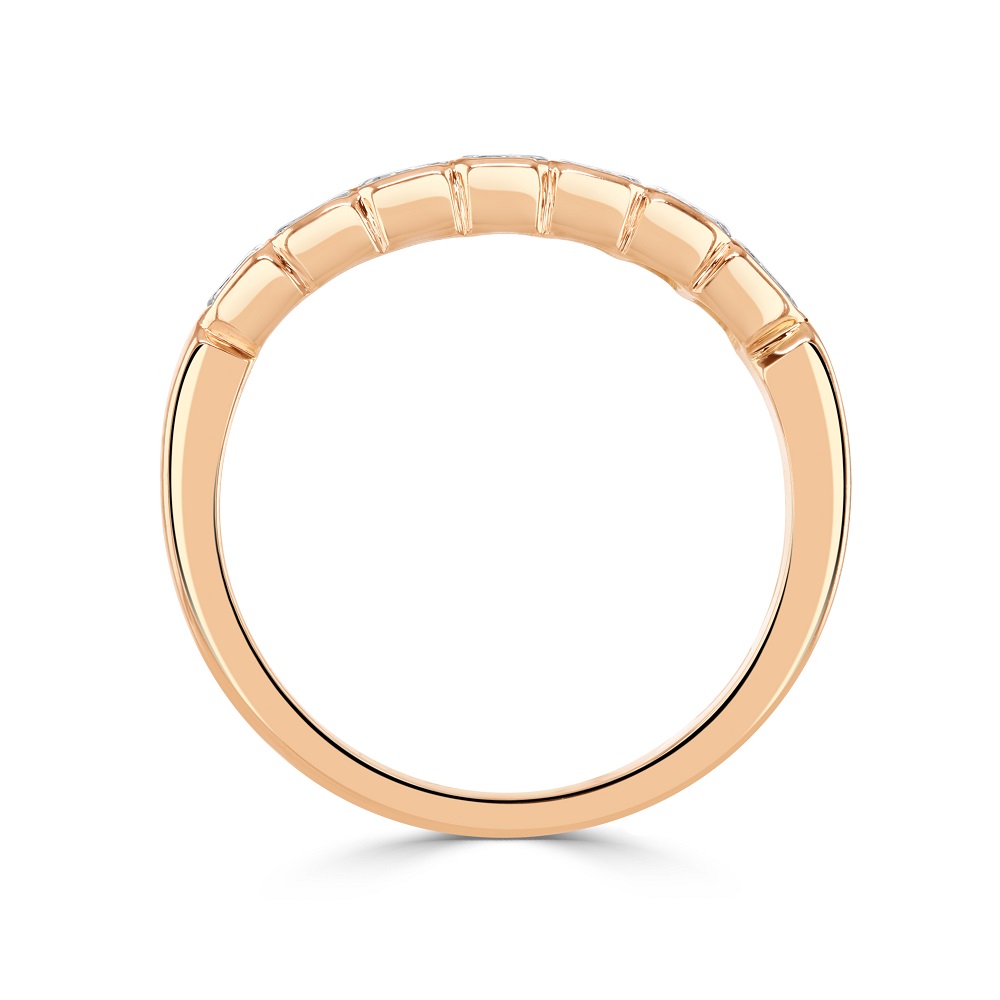 The warm, romantic hue of the 18ct rose gold beautifully complements the clear, geometric lines of the emerald cut diamonds, creating a harmonious balance of colour and form. This ring is not just a piece of jewellery; it's a testament to enduring love and the perfect way to mark significant moments and milestones.