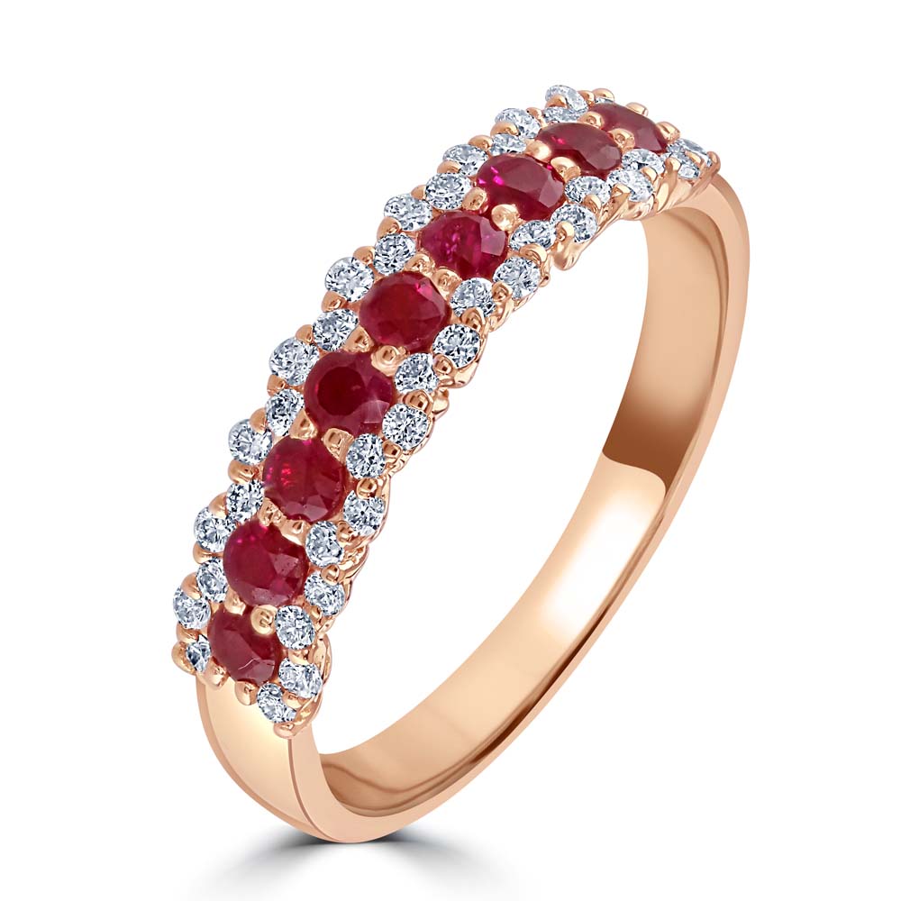 Enhance your collection with our exquisite 18ct rose gold ring, meticulously crafted to showcase nine spectacular claw-set round rubies. Each ruby is elegantly framed by a halo of sparkling round brilliant cut diamonds, adding a radiant touch of luxury. The total weight of the rubies is 0.60 carats, complemented by 0.28 carats of diamonds. This stunning piece combines timeless elegance with a modern flair, making it a perfect choice for those seeking both style and sophistication.