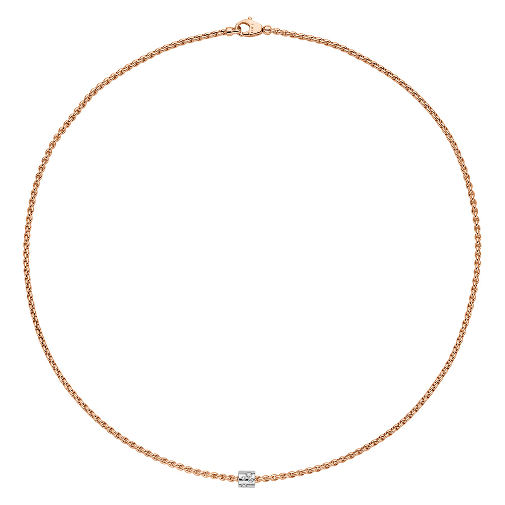 Explore the epitome of luxury and style with our 18ct rose gold rope style necklace, a standout piece from the Aria collection by Fope Gioielli. This sophisticated necklace features a delicate, fine gold mesh chain in rose gold, accented with a single 18ct white gold rondel. The rondel is artistically set with scattered round brilliant cut diamonds of varying sizes, adding a touch of unexpected sparkle and elegance. Aimed at emerging luxury consumers and inspired by the athleisure fashion trend, this necklace perfectly blends casual sophistication with high-end allure. The Aria collection encourages personal expression through mix-and-match capabilities, offering pieces in three gold colourways and designed for both women and men. Enhance your wardrobe with this versatile necklace, ideal for those who appreciate modern luxury and innovative design.
