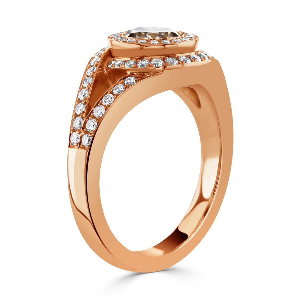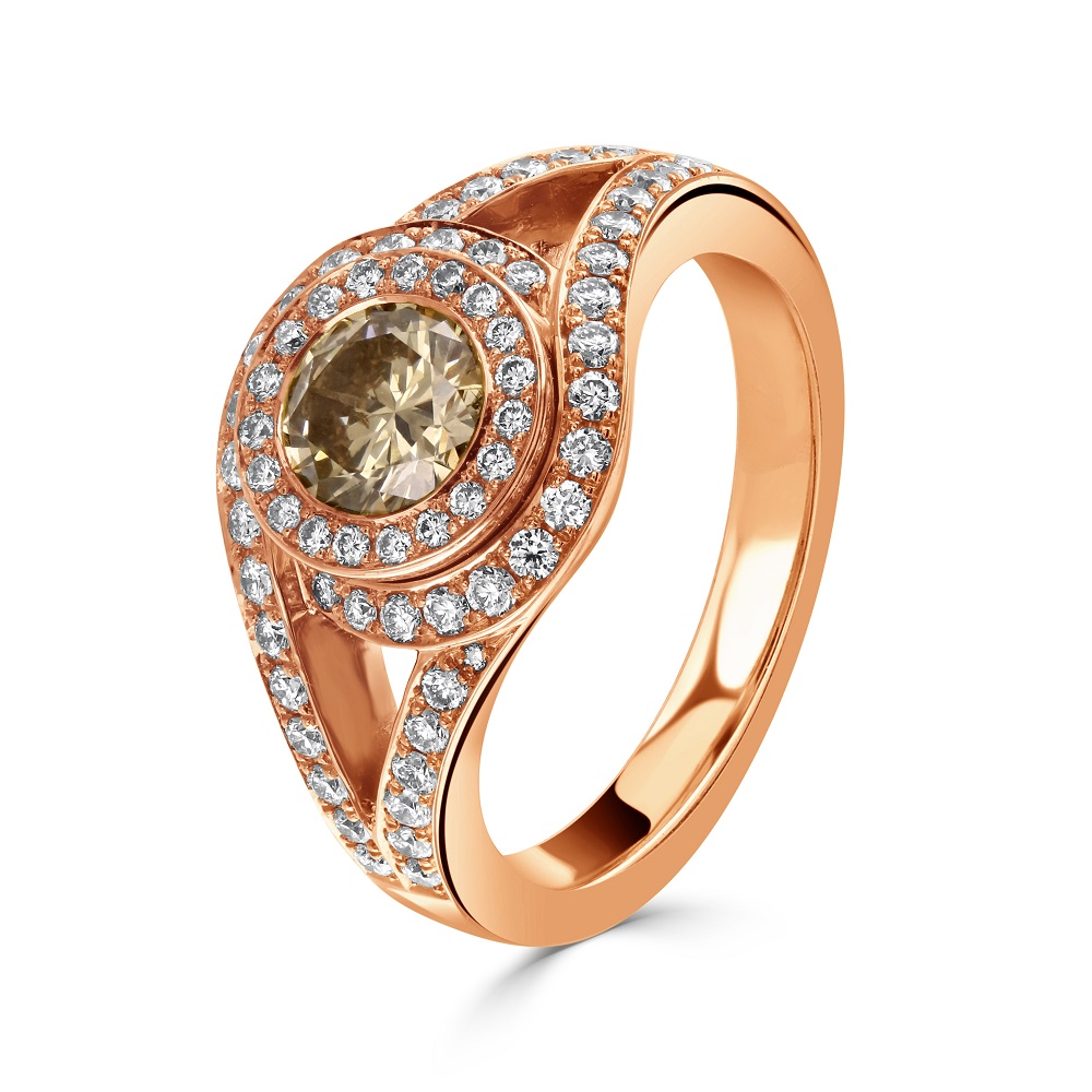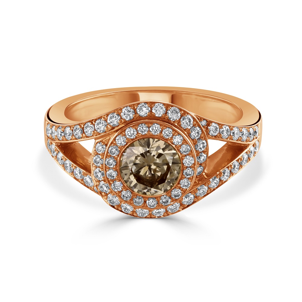 An exquisite 18ct Rose Gold Cluster Ring, a masterpiece of fine jewellery design. This breathtaking ring centres around a captivating round brilliant cut cognac diamond, meticulously rubover set to showcase its rich, warm hues and exceptional clarity, weighing 0.70ct. Encircling this stunning centrepiece is a halo of micro-claw set round brilliant cut diamonds, adding a radiant sparkle that enhances the central diamond's allure.