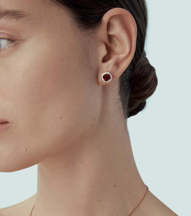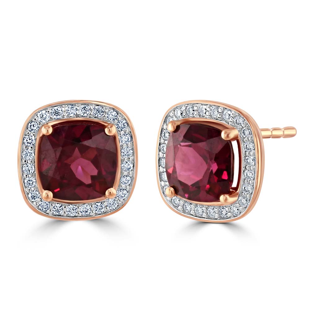 Luxurious 18ct rose gold stud earrings, a symphony of colour and sparkle designed to captivate and charm. At the heart of each earring lies a mesmerizing cushion cut rhodolite, weighing a total of 2.30ct, securely held in place by four elegant claws. This stunning centrepiece is encircled by a radiant cluster of pavé set round brilliant cut diamonds, adding an extra layer of brilliance and sophistication. Crafted with precision, these earrings feature post and butterfly fittings, ensuring a comfortable and secure fit. Whether as a gift for a loved one or a treat for yourself, these rhodolite and diamond stud earrings are a testament to timeless elegance and exquisite craftsmanship.