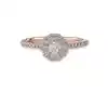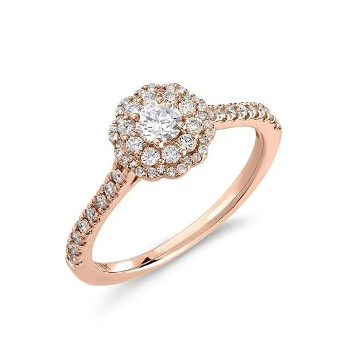 Our exquisite 18ct rose gold Halo ring is a masterpiece of fine craftsmanship and dazzling design. At the centre of this stunning piece lies a claw-set round brilliant cut diamond, weighing 0.19ct, encircled by two rows of meticulously placed round brilliant cut diamonds that enhance the central stone's radiance. Adding to the opulence, the ring's shoulders are also adorned with brilliant cut diamonds, contributing an additional 0.12ct to the overall sparkle.