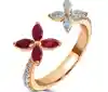 Discover the enchanting beauty of our 18ct rose gold open ring, a stunning display of floral elegance and artistic design. This unique ring features two delicately crafted flowers: one bloom is claw-set with four marquise-cut rubies totalling 0.77 carats, radiating vibrant red hues, while the other sparkles with four marquise-cut diamonds totalling 0.55 carats. The ring's shoulders are further embellished with round brilliant-cut diamonds, enhancing its overall brilliance and charm. Crafted in lustrous 18ct rose gold, this ring marries the natural beauty of floral motifs with the luxury of precious gemstones. Perfect for those seeking a statement piece with a romantic touch, it makes a magnificent choice for special occasions or as an eye-catching addition to any fine jewellery collection.