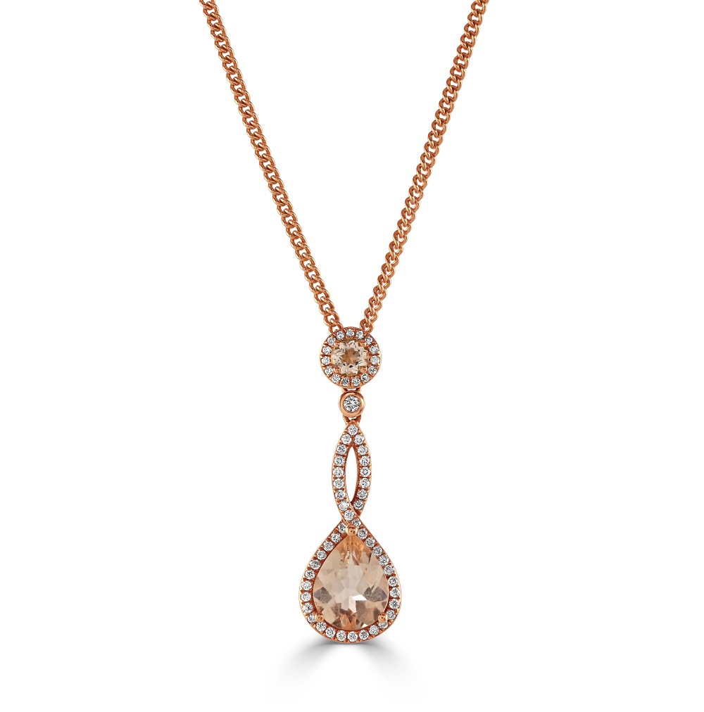 Designed for those who cherish unique and sophisticated jewellery, this drop pendant is perfect for special occasions, offering a touch of glamour and a statement of refined taste. Whether it's a gift for a significant other, a milestone celebration, or a luxurious addition to your personal collection, this rose gold morganite and diamond pendant is sure to captivate and enchant, promising to be a beloved treasure for years to come.