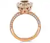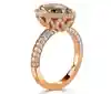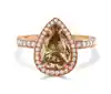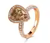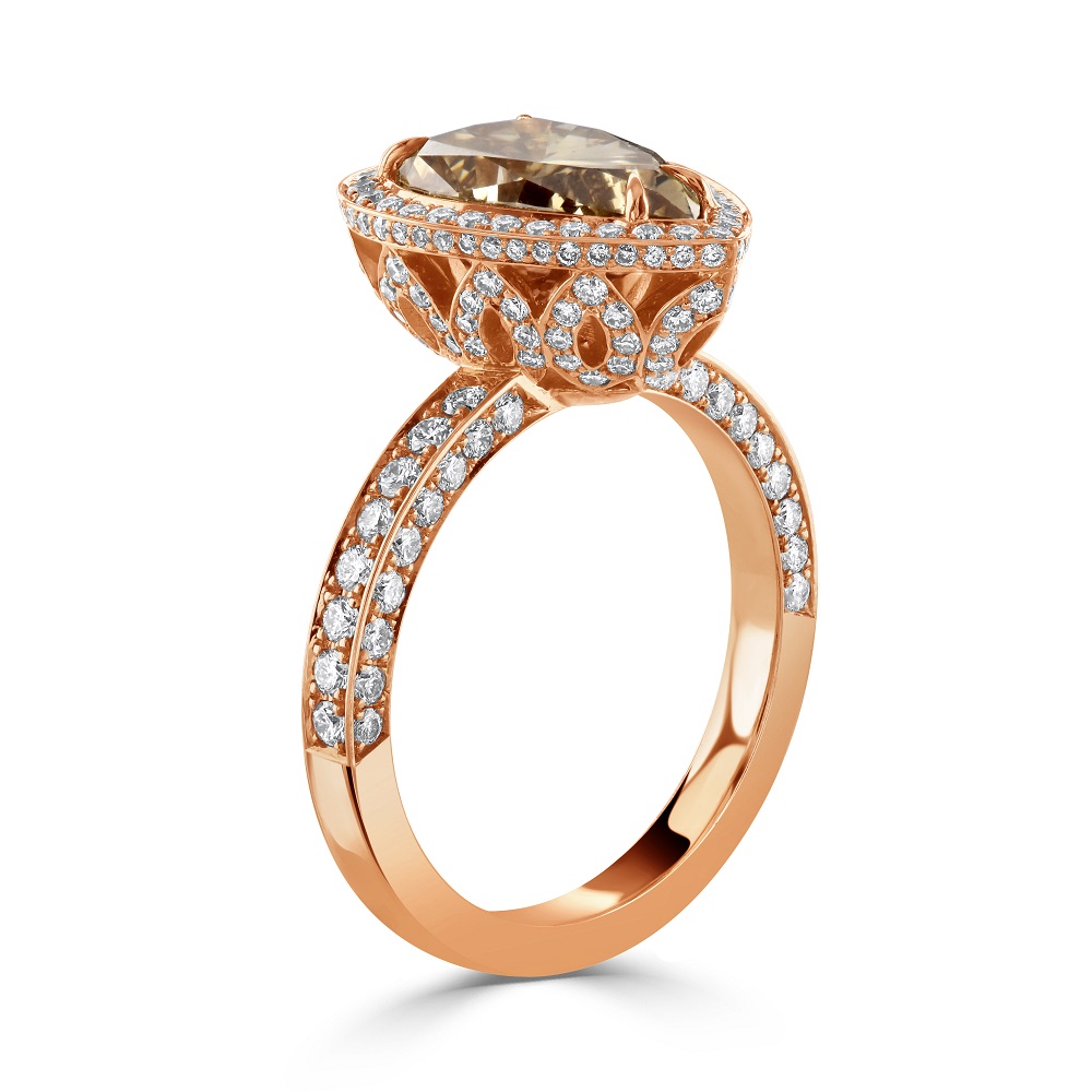 The epitome of sophistication and allure, our 18ct rose gold cognac diamond cluster ring, a masterpiece designed to captivate and charm. At the heart of this exquisite ring sits a mesmerizing 3.00ct pear-shaped brilliant-cut cognac diamond, securely held by four claws, radiating warmth and elegance. Encircling this central stone is a halo of sparkling round brilliant-cut diamonds, enhancing the rich hues of the cognac diamond and adding an extra layer of brilliance. This stunning piece features a diamond-set fancy openwork gallery, showcasing meticulous craftsmanship and attention to detail. Adding to its splendour, each shoulder of the ring is adorned with a single row of diamonds on three sides, totalling 214 diamonds with a combined weight of 1.09ct. These diamonds not only contribute to the ring's breathtaking sparkle but also complement the unique beauty of the cognac diamond. Crafted from the finest 18ct rose gold, the ring's band provides a warm and luxurious backdrop that perfectly complements the glow of the diamonds. Whether as an unforgettable engagement ring, a milestone gift, or a personal indulgence, this 18ct rose gold cognac diamond cluster ring promises to be a treasure that will be cherished for generations, embodying the perfect blend of luxury, elegance, and timeless beauty.