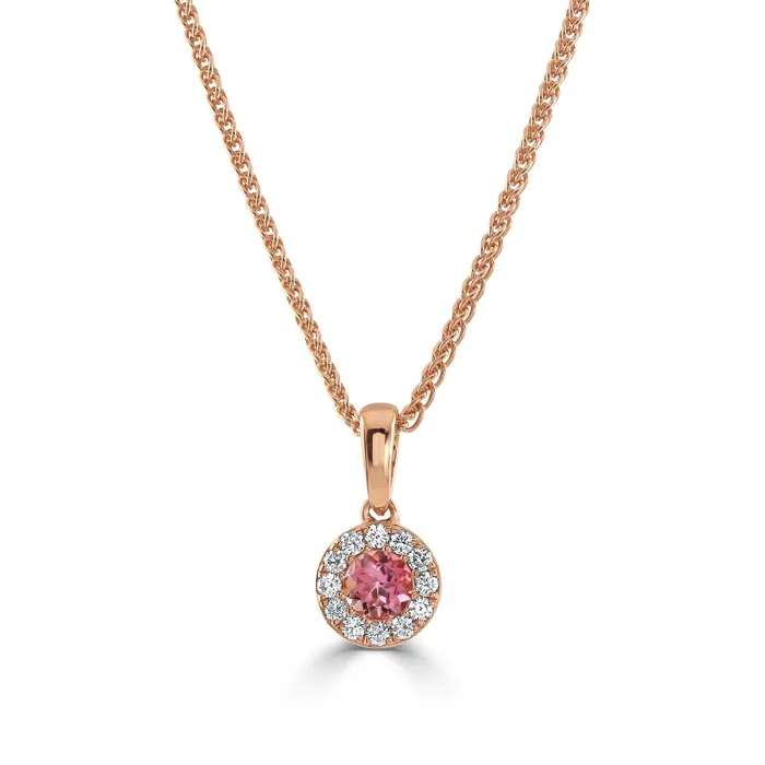 18ct Rose Gold Pink Tourmaline and Diamond Halo Pendant