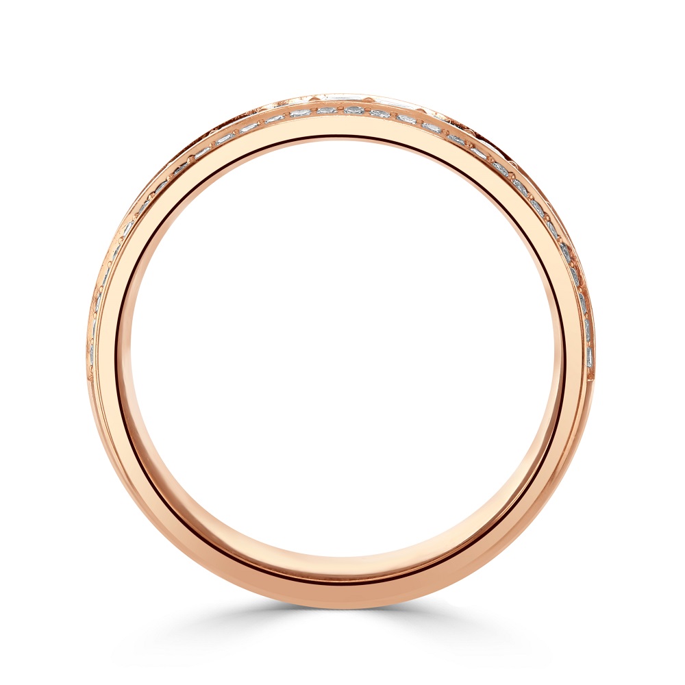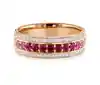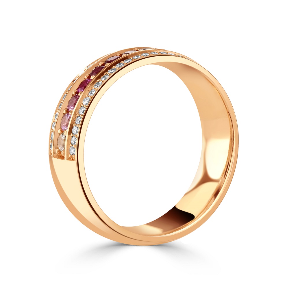 Discover the refined elegance of our 18ct rose gold ring, a masterpiece of jewellery design that combines the rich hues of rubies and pink sapphires with the sparkling brilliance of diamonds. This exquisite ring features a stunning arrangement where rubies and pink sapphires, totalling 0.75 carats, are beautifully claw-set down the centre, gradually fading into lighter tones at each end. Along each side of the band, 30 round brilliant-cut diamonds, totalling 0.30 carats, are meticulously set to create an enchanting shimmer that complements the warm tones of the rose gold. This ring is a perfect blend of luxury and sophistication, making it an ideal choice for those special occasions or as a standout addition to any fine jewellery collection.