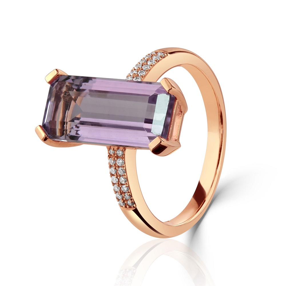 This elegant cocktail ring has a central long octagonal pink amethyst with diamonds shimmering down each shoulder. Pink Amethyst has a unique combination of colour, transparency, and beauty. Its lavender nuances bring peace, harmony and emotional balance.