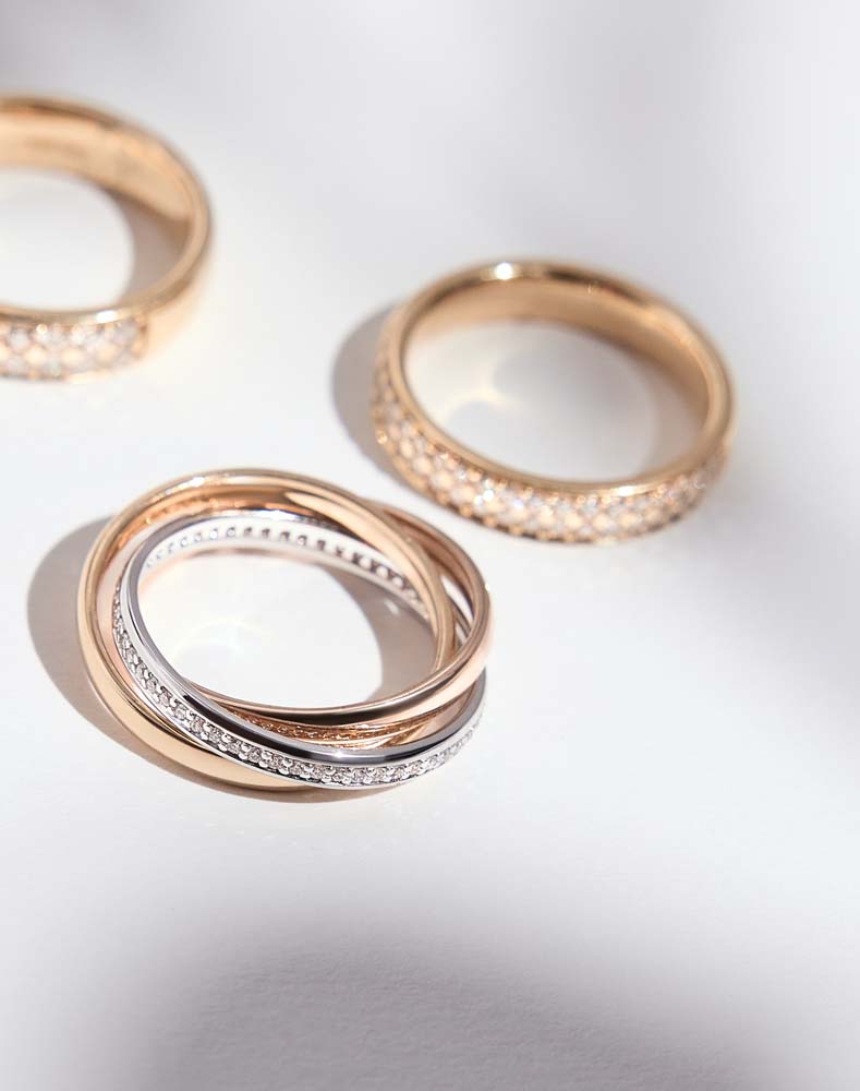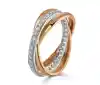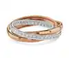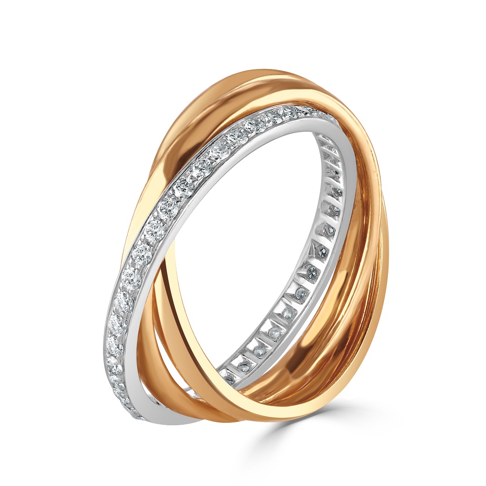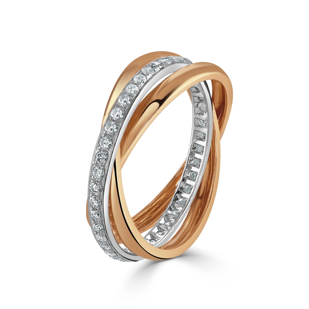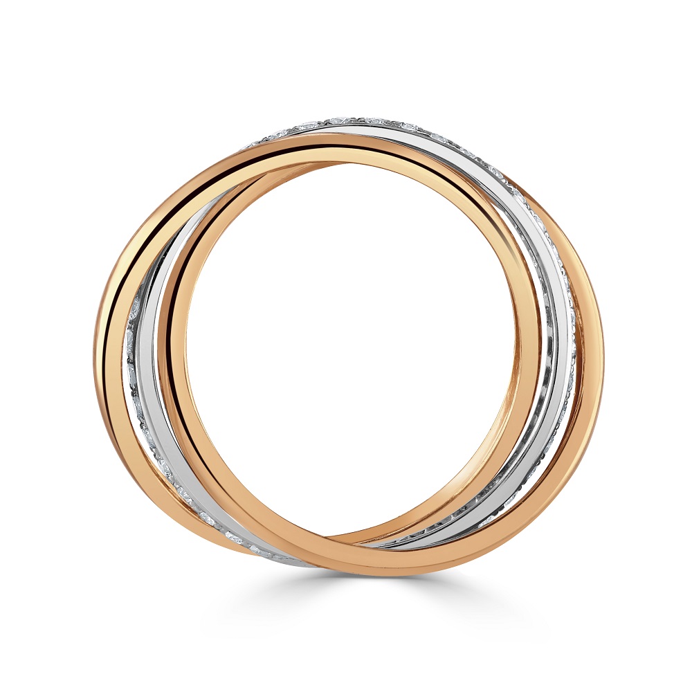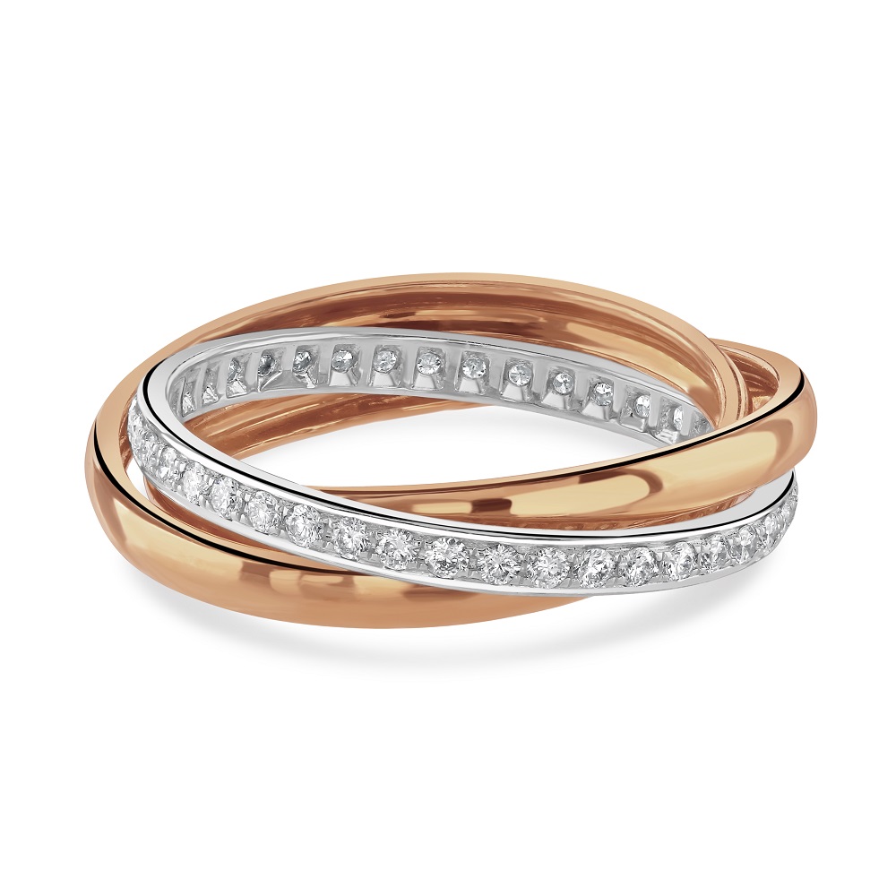 Embrace the elegance of our 18ct gold three band triple style ring, a beautifully crafted piece that showcases the harmony of contrasting metals. This sophisticated ring features two 18ct rose gold bands with their warm, romantic hues, and one 18ct white gold band, exquisitely set with sparkling diamonds totalling 0.42 carats. The intricate design blends the subtle sheen of rose gold with the brilliant sparkle of the diamond-encrusted white gold, creating a stunning visual contrast. Ideal for those who appreciate a blend of contemporary and classic aesthetics, this ring is perfect for adding a touch of glamour to any ensemble or as a distinctive gift for a special occasion. Elevate your jewellery collection with this versatile and stylish ring, designed to make a lasting impression.