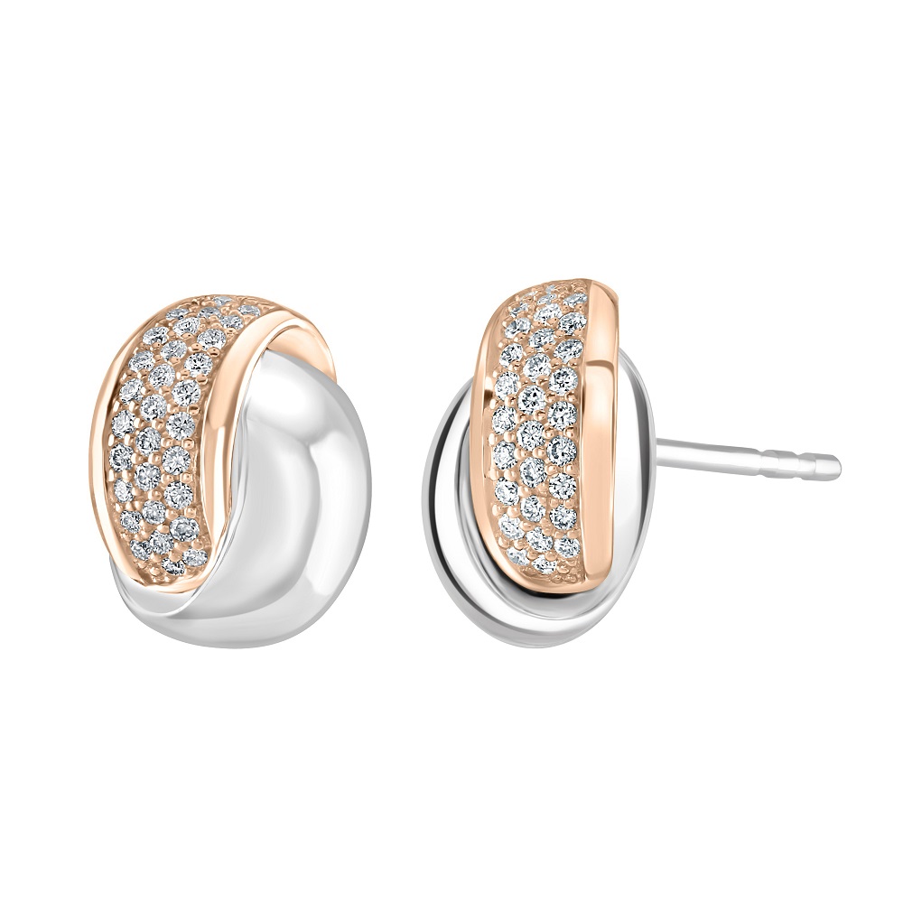 The delicate interplay of the two gold tones enhances the overall beauty of the earrings, making them a versatile choice for any occasion, from daily wear to special events. The diamonds are meticulously set along the rose gold band, adding a touch of sparkle and luxury that catches the eye.