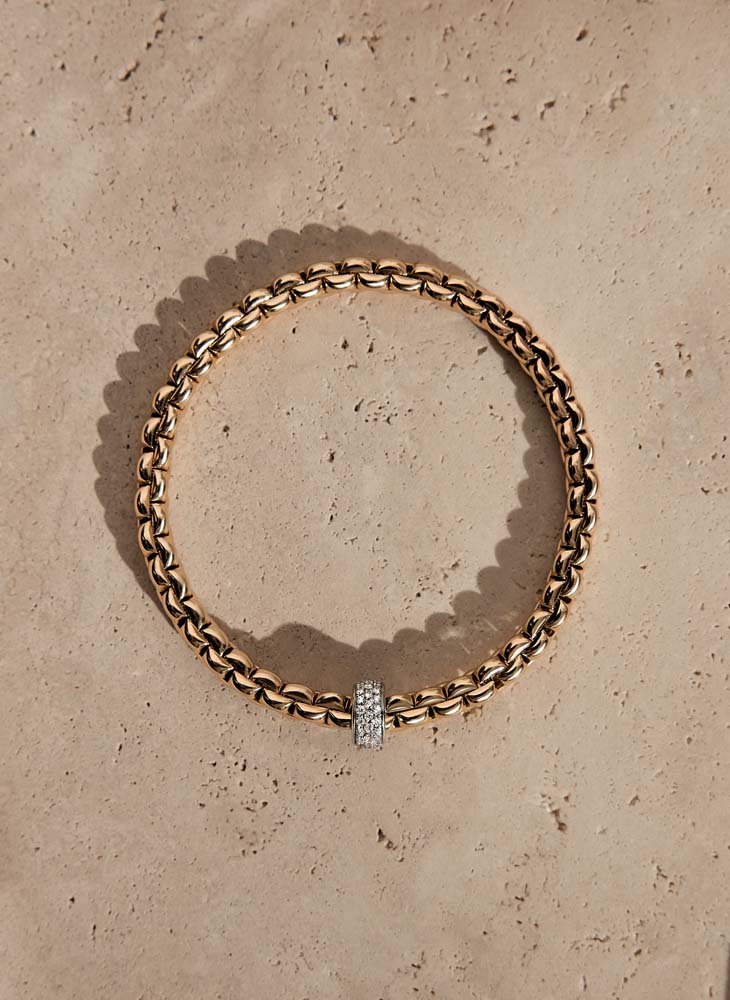Embrace the exquisite craftsmanship of Fope Gioielli with our 18ct rose gold Flex'It Eka bracelet, a blend of luxurious design and contemporary elegance. This stunning bracelet features the patented Flex'It design, ensuring unmatched comfort and flexibility, crafted in radiant 18ct rose gold. At its centre, a white gold rondel pavé set with shimmering diamonds adds a sophisticated sparkle, with a total diamond weight of 0.37 carats. This delicate balance of rose and white gold, combined with the brilliance of diamonds, makes the bracelet a versatile accessory for any occasion, from casual outings to more formal events. A testament to Italian luxury and style, this bracelet is perfect for those who value elegance and innovative design.