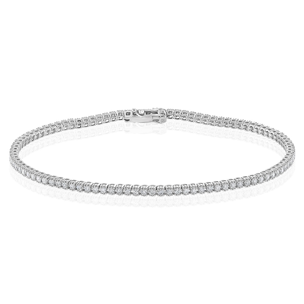 Experience the ultimate in elegance with our 18ct white gold diamond line bracelet, a stunning display of luxury and sophistication. This exquisite bracelet is claw-set with 101 round brilliant cut diamonds, totalling 1.10 carats, that dazzle with unmatched brilliance. Each diamond is expertly placed to create a continuous line of sparkle that wraps delicately around the wrist. Crafted from premium 18ct white gold, this bracelet offers a sleek and polished look that is timeless yet contemporary. Perfect for special occasions or adding a touch of glamour to everyday wear, this diamond line bracelet is a must-have for anyone seeking to elevate their fine jewellery collection with a piece that offers both style and radiance.