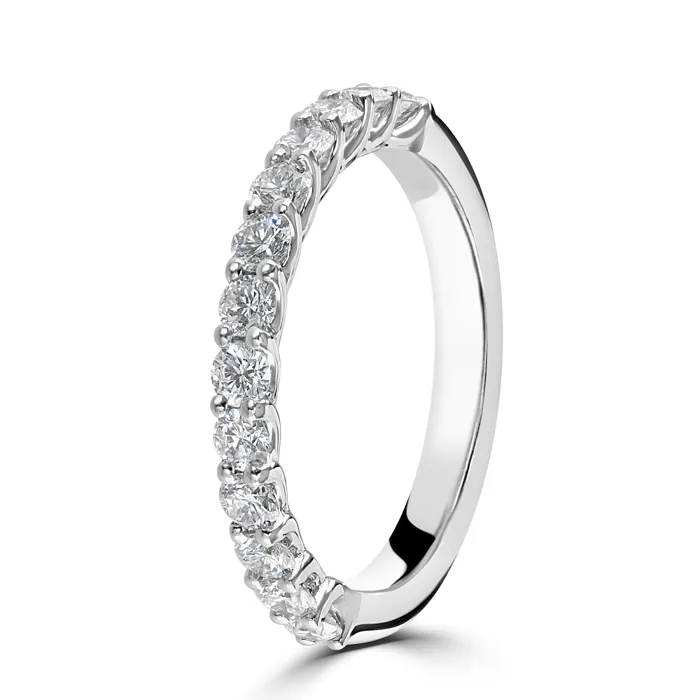 Indulge in the classic beauty of our 18ct white gold half eternity ring, meticulously crafted to showcase a timeless elegance. This sophisticated ring features 13 round brilliant cut diamonds, each securely held by a four-claw setting, totalling a substantial 0.75 carats. The diamonds are expertly arranged to provide a continuous band of sparkle that wraps elegantly around the finger, enhancing its overall brilliance and appeal. Crafted from premium 18ct white gold, this ring combines durability with a sleek, polished finish, making it perfect for celebrating anniversaries, as a wedding band, or for adding a touch of luxury to everyday wear. Embrace this exquisite piece as a symbol of eternal love, designed to dazzle and delight for years to come.
