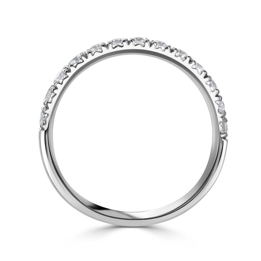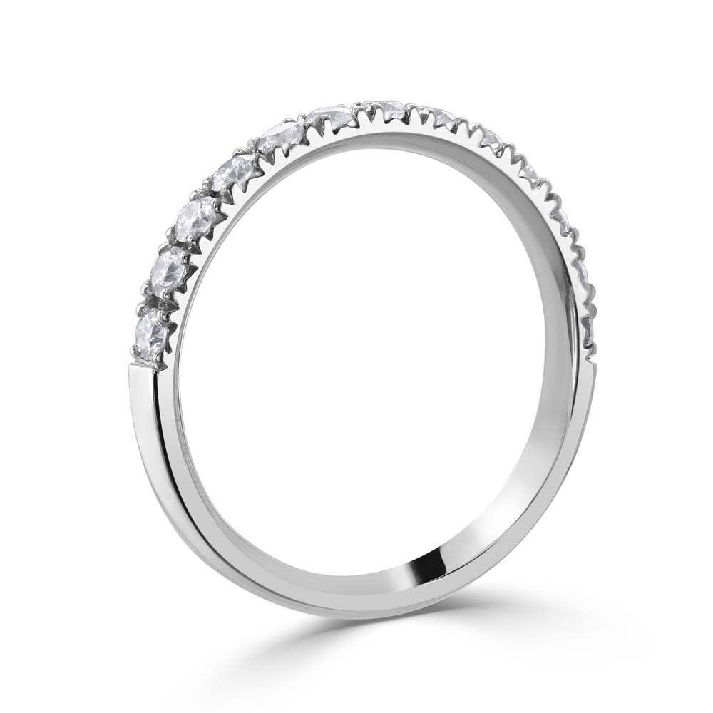 An exquisite 18ct white gold half eternity ring, beautifully adorned with 14 claw-set round blue topaz stones. This refined ring combines luxury with timeless design, featuring a total blue topaz weight of 0.58ct. Each blue topaz is meticulously set to showcase its vibrant azure hue and sparkling clarity, reflecting both light and elegance with every turn of the hand.