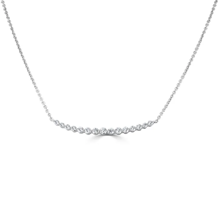 Suspended from a delicate 16-inch 18ct white gold chain, the pendant sits perfectly at the collarbone, making it an ideal piece for both layering and wearing solo. The curved design of the bar adds a modern twist to this classic piece, allowing it to catch the light from every angle.