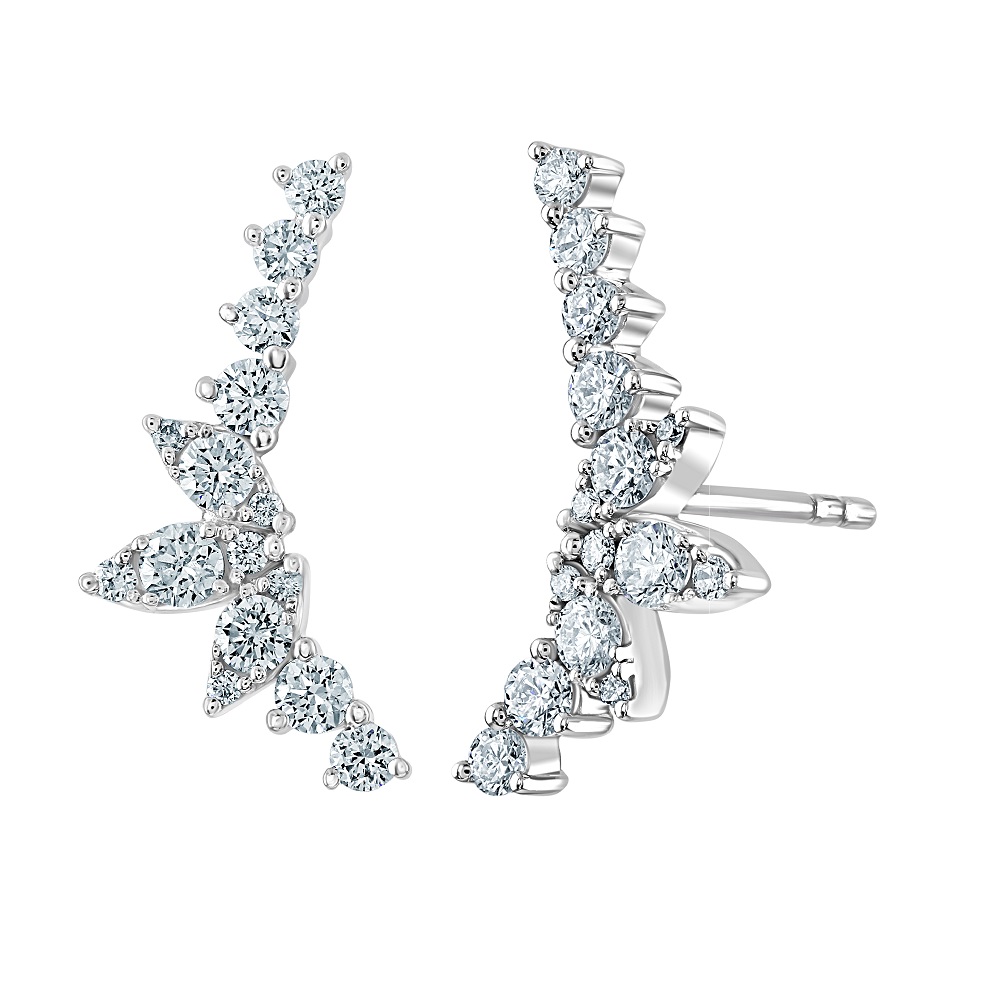 Our elegant 18ct white gold curved stud earrings, each meticulously crafted with 15 claw-set round brilliant cut diamonds. These sophisticated earrings boast a total diamond weight of 0.67 carats, ensuring a radiant display of sparkle that complements any attire. The unique curved design of these studs beautifully contours along the earlobe, making them a standout addition to your jewellery collection. Equipped with secure post and butterfly fittings, they promise both comfort and style for day-long wear. Perfect for special occasions or as a luxurious everyday accessory, these diamond stud earrings are sure to captivate and charm.