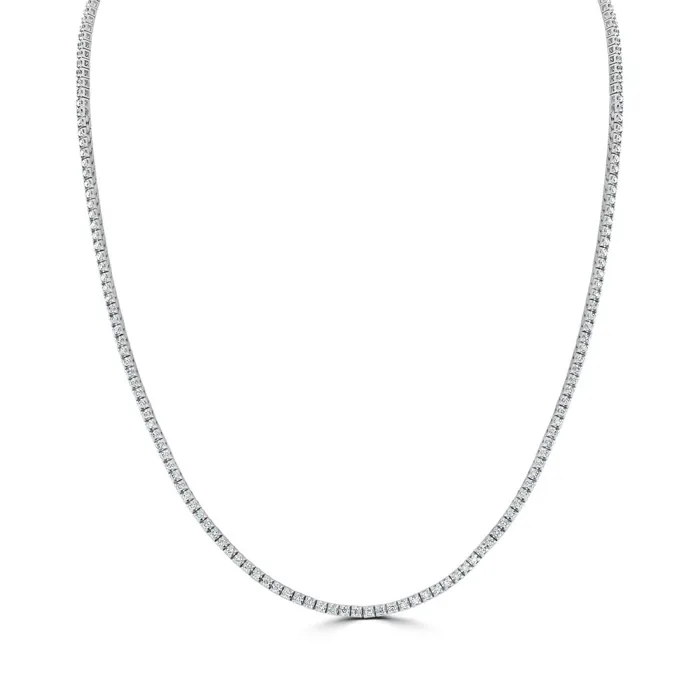A luxurious 18ct white gold line necklet, an exquisite piece of jewellery that blends timeless elegance with contemporary design. This stunning necklet features 195 round brilliant cut diamonds, each meticulously four claw-set within square-shaped links, creating a dazzling display of light and brilliance. With a total diamond weight of 2.10 carats, this necklet is designed to capture and reflect light beautifully, ensuring that it stands out with unparalleled sparkle. Crafted from premium 18ct white gold, this necklet boasts a sleek and polished finish that enhances the natural radiance of the diamonds. The geometric design of square links adds a modern touch to the classic beauty of the brilliant diamonds, making it a perfect piece for sophisticated events or as a standout addition to your everyday wardrobe. Ideal for those who appreciate fine craftsmanship and detailed design, this diamond line necklet is a statement piece that speaks of luxury and style. Whether you are looking to elevate a special occasion ensemble or add a touch of glamour to your casual attire, this necklet promises to be a versatile and cherished addition to any jewelry collection.