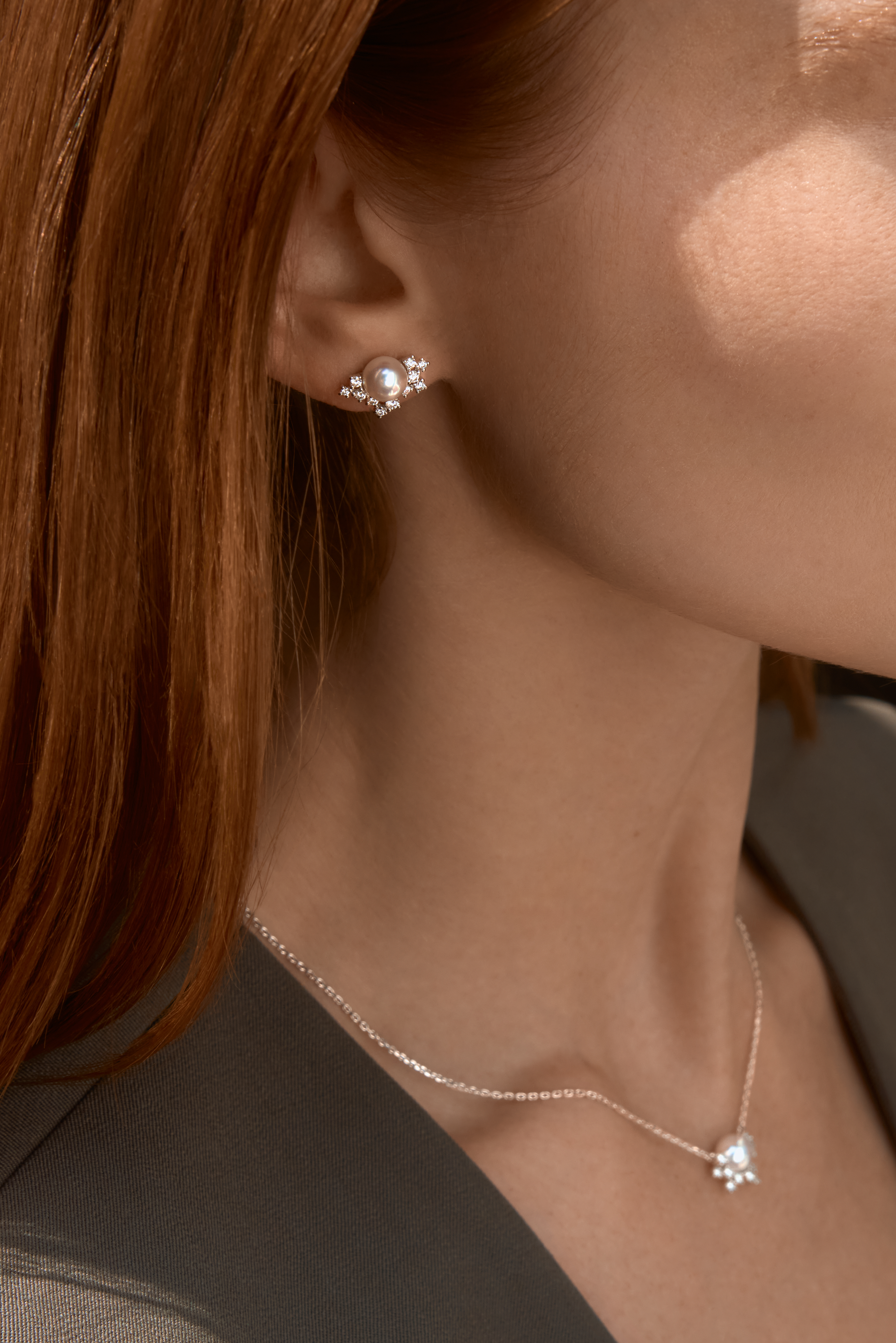 These unique stud earrings by Mikimoto, crafted in 18ct white gold, offer both elegance and versatility. Each earring showcases a single Akoya cultured pearl, celebrated for its smooth surface and radiant luster. Adding a distinctive touch, beneath each pearl is a detachable element featuring eleven round brilliant cut diamonds. These diamonds are claw set and arranged in a scattered pattern, creating a playful yet sophisticated cascade of sparkle under the pearl. The design allows for the diamond section to be removed, offering the versatility to wear the classic pearl studs alone for a more understated look or with the diamonds for added glamour. The earrings come with post and butterfly fittings, ensuring a secure and comfortable fit.