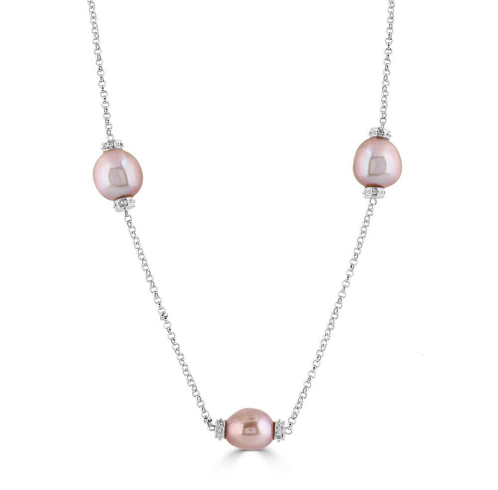 A stunning 18ct white gold 20" Chain, adorned with five equally spaced multi-coloured Baroque Pearls, each flanked by a small diamond-set rondel on either side. This exquisite necklace combines the unique beauty of Baroque pearls with the timeless elegance of diamonds, offering a total diamond weight of 0.10ct. The vibrant colours of the pearls make this piece versatile enough to complement any outfit, from casual daytime looks to more formal evening wear. Whether you're treating yourself or searching for the perfect gift, this necklace is sure to dazzle and delight.