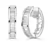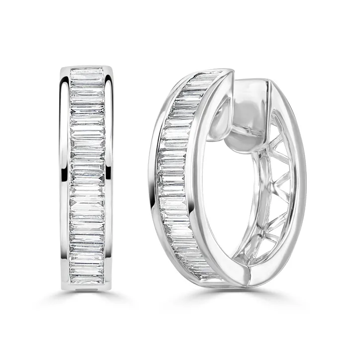 Our luxurious 18ct white gold hinged hoop earrings are each adorned with 22 elegantly channel-set baguette cut diamonds, totalling 1.50 carats. These exquisite diamonds are precisely aligned within the sleek white gold framework, offering a continuous stream of shimmer and a distinctly modern geometric appeal. The hinged design ensures easy wearability and secure closure, making these earrings both functional and fashionable. Perfect for sophisticated evenings or adding a touch of glamour to everyday wear, these hoop earrings blend classic elegance with contemporary design, making them an essential addition to any fine jewellery collection.