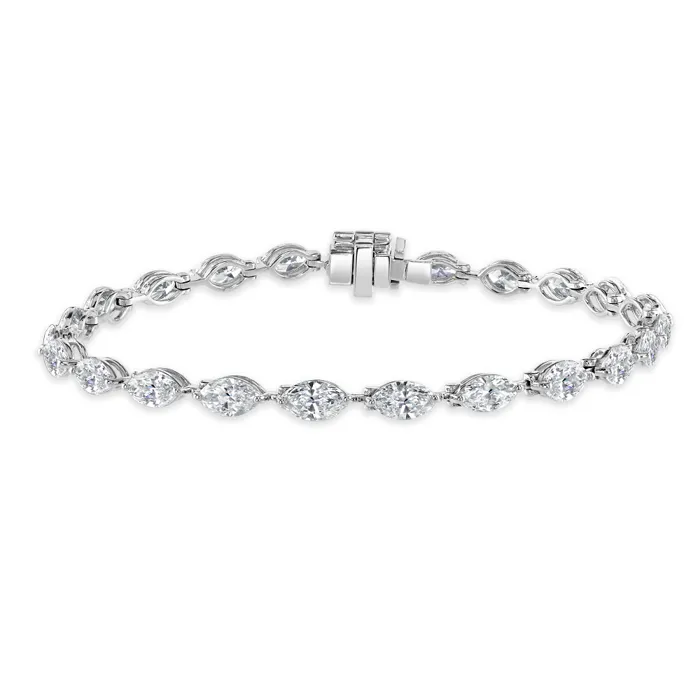 Our exquisite 18ct white gold line bracelet is meticulously crafted with 23 marquise cut diamonds. Each diamond is carefully set in a classic claw setting, showcasing the unique beauty and precision of the marquise cut. This bracelet is not only a testament to timeless elegance but also provides peace of mind with its secure tongue clasp and additional security catch. With a total diamond weight of 6.58ct, this bracelet radiates unparalleled brilliance and sophistication. Whether adorning your wrist at an event or adding a touch of glamour to your everyday wear, this diamond line bracelet is a stunning statement piece that promises to captivate and charm. Perfect for those who appreciate the finer things in life, it makes an exceptional gift or a magnificent addition to your luxury jewellery ensemble.