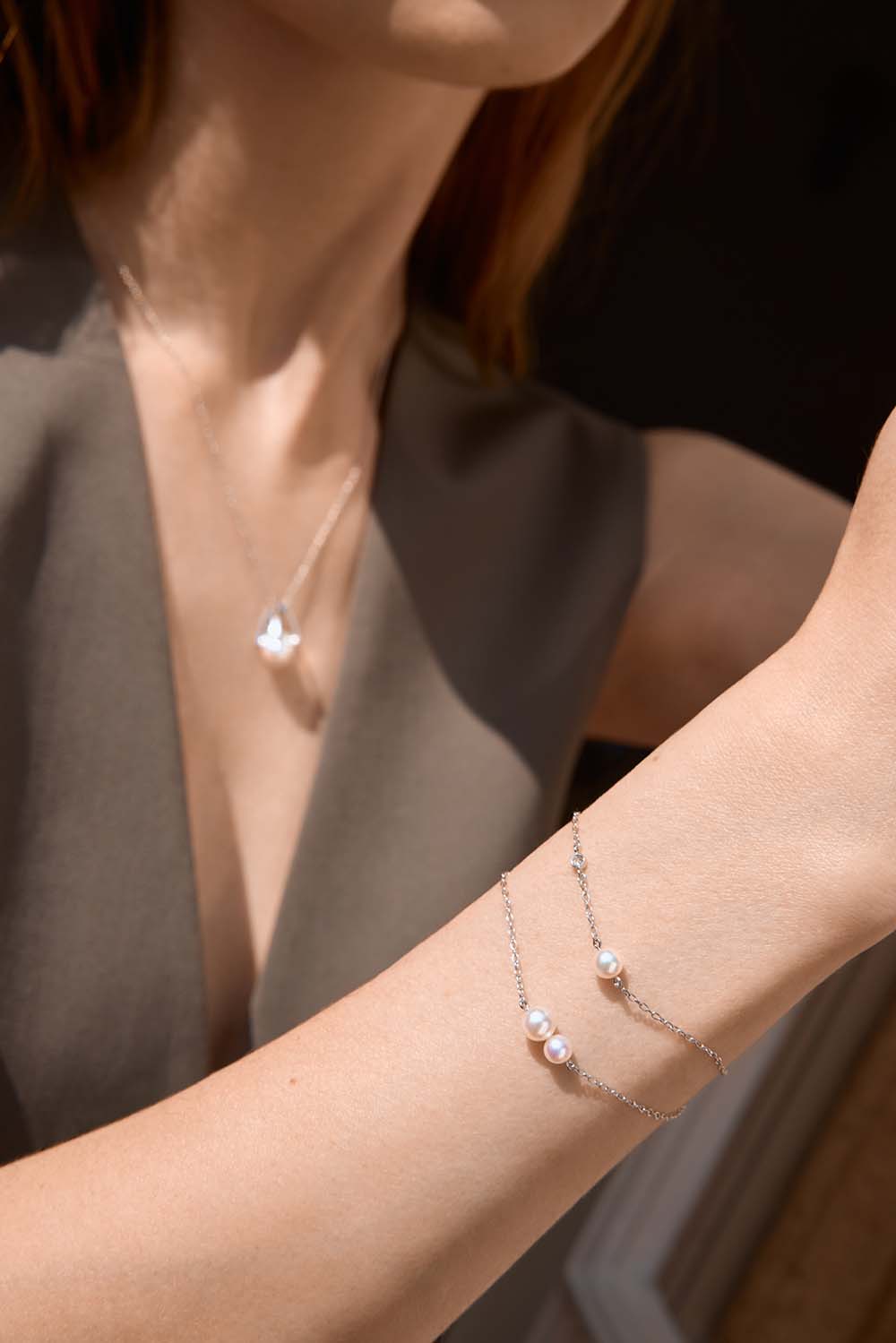 A charming Mikimoto 18ct white gold bracelet featuring two side-by-side Akoya cultured pearls The pearls, measuring 5.0mm and 6.0mm in diameter, showcase Mikimoto's dedication to quality and beauty, embodying the perfect blend of size and luminosity. With a length of 18cm, this bracelet is designed to gracefully adorn the wrist, providing a comfortable fit and a touch of sophistication to any ensemble. Whether you're looking for a subtle addition to your daily wear or a striking accent for special events, this bracelet promises to captivate and charm.