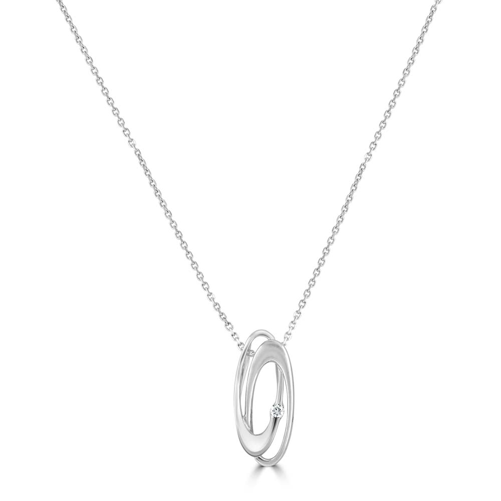 A sleek pendant, featuring two entwined ovals crafted from 18ct white gold, one with a brushed finish and the other polished, creating a captivating interplay of textures. At the heart of one oval, a single round brilliant cut diamond, weighing 0.04 carats, is meticulously set, providing a subtle yet striking sparkle. This pendant is gracefully suspended from a 14-inch filed trace chain, enhancing its sophisticated appeal. Perfect for those who appreciate minimalist design with a touch of luxury, this piece is ideal for everyday wear or special occasions, offering a versatile and stylish addition to any jewellery collection.