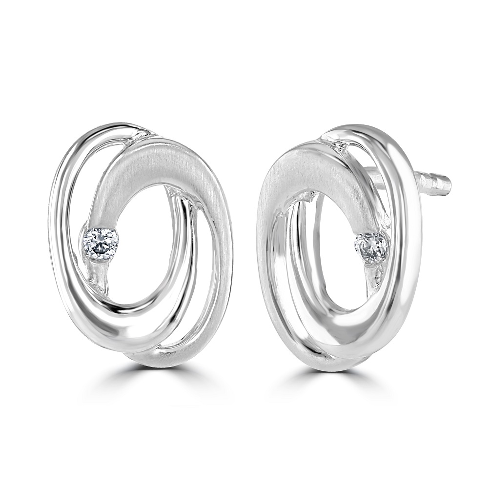 Our elegant 18ct white gold entwined oval stud earrings feature a unique and sophisticated design. Each earring showcases two interlocking ovals—one with a brushed finish and the other polished—creating a stunning contrast that highlights the craftsmanship and attention to detail. Adding a touch of brilliance, a single round brilliant cut diamond is set in one of the ovals, providing just the right amount of sparkle. Crafted from premium 18ct white gold, these stud earrings exude luxury and style. The combination of polished and brushed finishes offers a versatile look that can transition effortlessly from day to night. Each earring is equipped with a post and butterfly fitting, ensuring a secure and comfortable fit for pierced ears. This reliable fastening system allows for easy application and removal, making them a practical choice for daily wear.