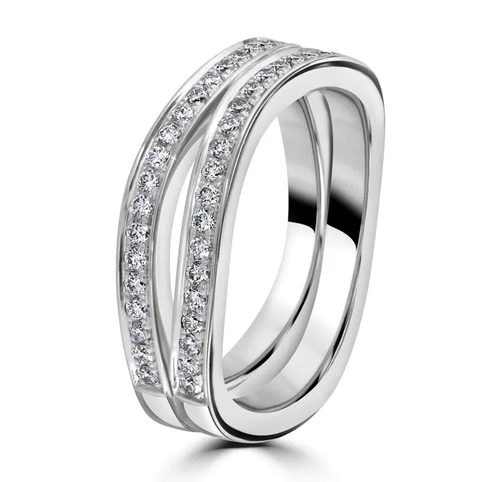 Discover the dynamic elegance of our 18ct white gold 'Wave' ring, beautifully crafted with a flowing, wave-inspired design. This stunning piece features two rows of round brilliant cut diamonds, totalling 50 in number, with a combined weight of 0.47ct. Each diamond is meticulously selected for its exceptional colour (G) and clarity (SI), ensuring a radiant display of sparkle that mimics the shimmering quality of water. The wave design of the ring offers a contemporary twist on traditional diamond bands, making it a standout piece perfect for those who appreciate the beauty of nature and the art of fine jewellery. The sleek white gold setting enhances the brilliance of the diamonds and provides a durable, timeless finish that's perfect for everyday wear or special occasions.