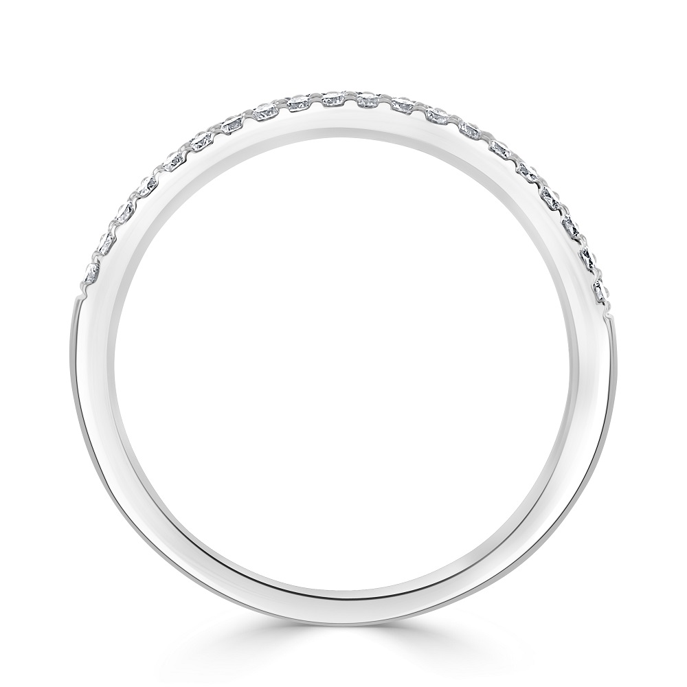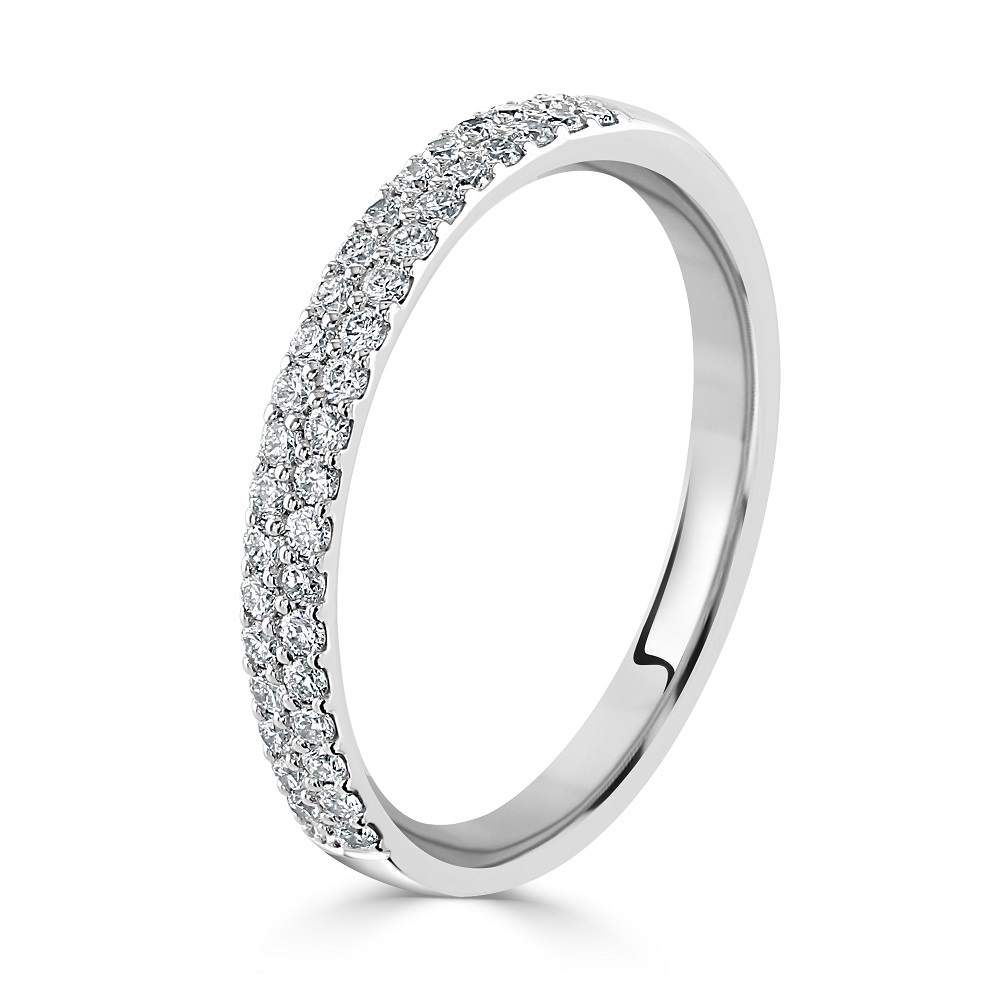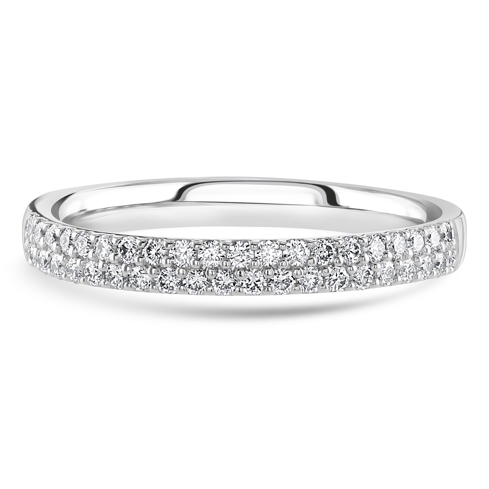 A beautiful 18ct white gold two row half eternity ring pavé claw set with sparkling round brilliant cut diamonds. Other sizes and variations are available, please contact the store for more information.