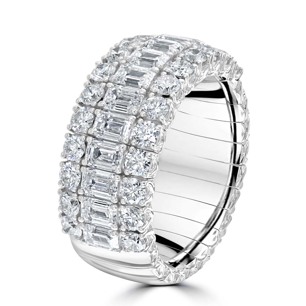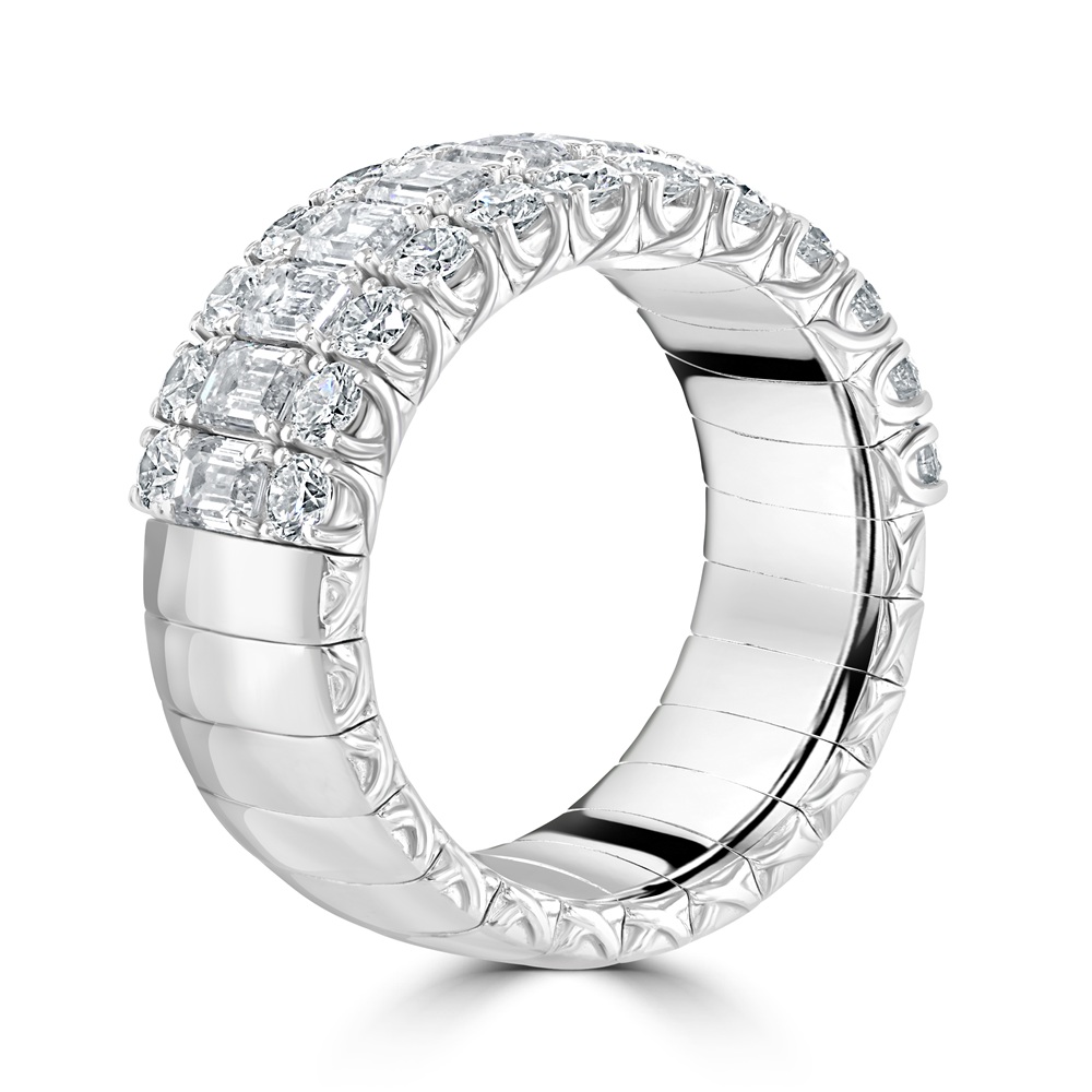 Elevate your jewellery collection with this exquisite 18ct white gold Picchiotti Xpandable™ half eternity ring, masterfully crafted in Italy to combine luxury and innovation. Featuring a stunning row of 12 emerald cut diamonds claw-set along the centre, this elegant design is flanked by two rows of 12 round brilliant cut diamonds on either side, creating a dazzling display of brilliance and symmetry. Designed to fit finger sizes M ½ to S, the Xpandable™ technology ensures a comfortable and flexible fit without compromising on style. Perfect for marking a special occasion or adding timeless elegance to everyday wear, this luxury diamond eternity ring is a true statement of sophistication.