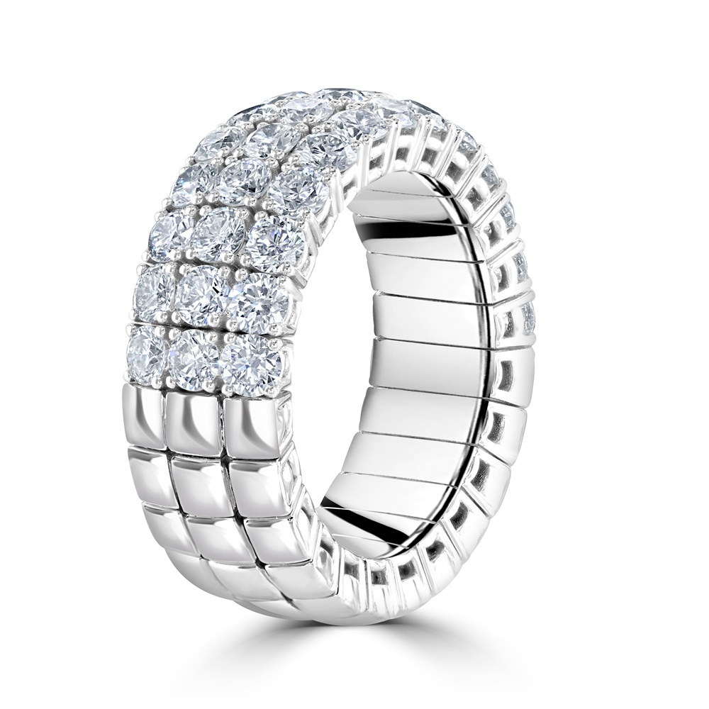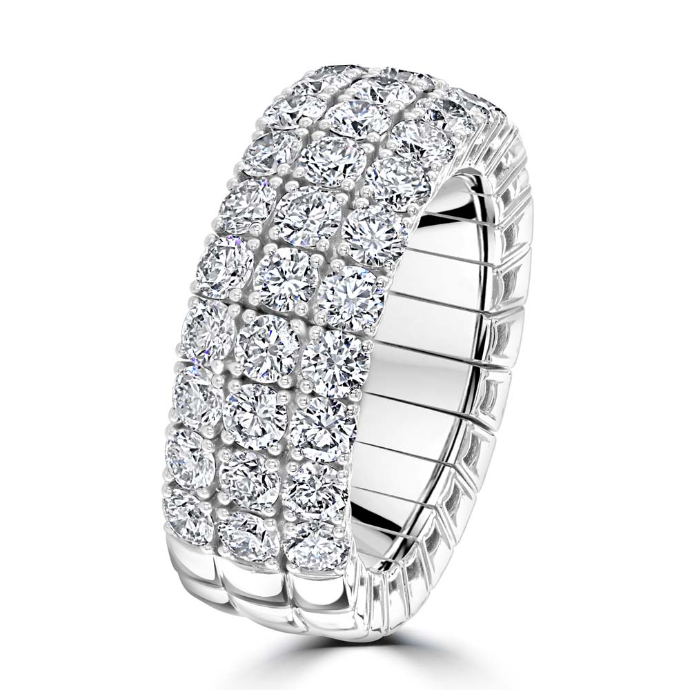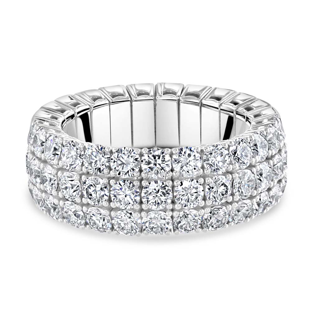 Experience the perfect blend of innovation and elegance with this 18ct white gold Xpandable™ half eternity ring, designed to offer both flexibility and enduring luxury. Featuring three dazzling rows of claw-set round brilliant cut diamonds, this exquisite piece showcases a total of 2.82ct of premium diamonds, graded F-G colour and VS clarity for exceptional sparkle and brilliance. Crafted with Xpandable™ technology, the ring effortlessly adjusts to fit finger sizes L½ to T, ensuring supreme comfort without compromising on style or structure. The triple-row design creates a bold yet refined statement, making it ideal for anniversaries, milestone celebrations, or as a luxurious stacking ring.