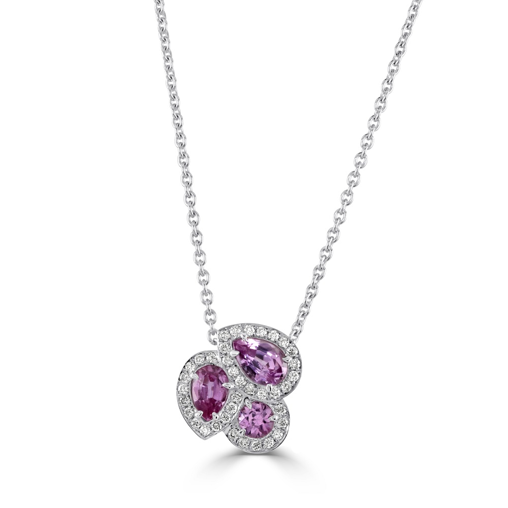 A stunning 18ct white gold pendant, a captivating showcase of elegance and style. This exquisite piece features three pink sapphires: two pear-shaped and one round, totalling 1.23 carats, each meticulously set to enhance their vibrant hues and sparkling brilliance. Surrounding these sapphires, 37 round brilliant cut diamonds, totalling 0.20 carats, create a dazzling halo that beautifully frames the central gemstones.
