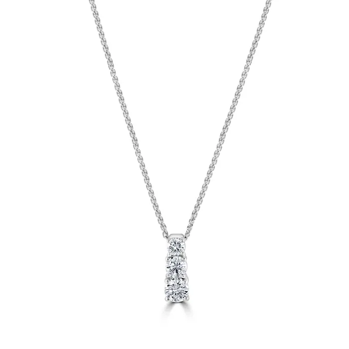 Sleek and sophisticated, this 18ct white gold pendant showcases a striking vertical arrangement of three graduated round brilliant cut diamonds, each claw set to maximise brilliance and light reflection. The diamonds—0.46ct, 0.31ct, and 0.20ct—create a graceful cascade of sparkle, symbolising timeless elegance and refined simplicity. Suspended from a classic 16-inch spiga chain, the pendant sits beautifully at the collarbone, making it perfect for both everyday luxury and special occasions. The spiga chain’s intricate weave adds subtle texture and strength, complementing the pendant’s clean lines and radiant design. A timeless piece with modern appeal, this pendant is a stunning addition to any fine jewellery collection—perfect for gifting or elevating your personal style.