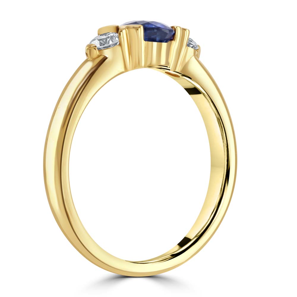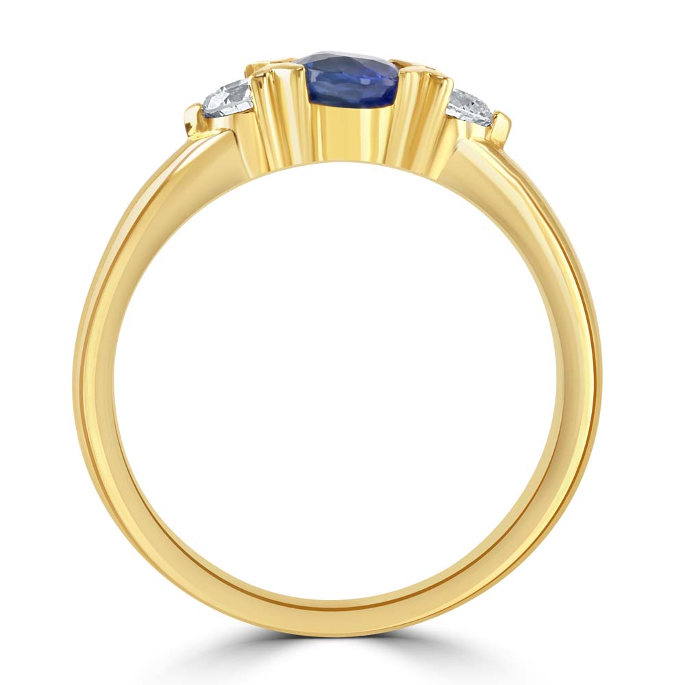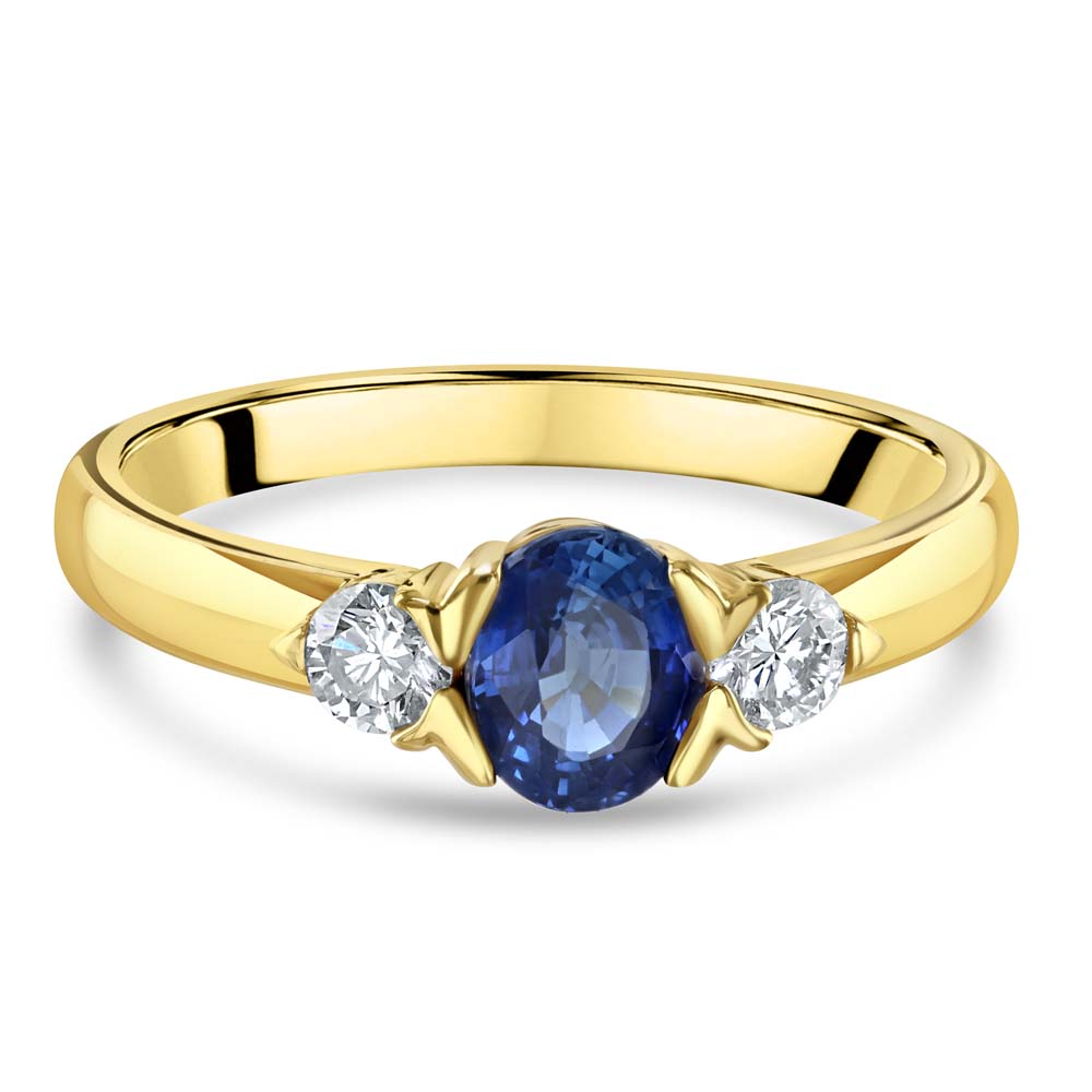 An exquisite 18ct yellow gold trilogy ring, a masterpiece of fine jewellery design featuring a stunning central oval cut sapphire, weighing 0.79 carats, partially rubover set for a sleek and modern appearance. Flanking this mesmerizing blue gemstone are two round brilliant cut diamonds, collectively weighing 0.24 carats, each expertly set to enhance their natural brilliance and sparkle. Crafted from luxurious 18ct yellow gold, this trilogy ring represents a perfect balance of elegance and timeless sophistication. The clean, smooth lines of the rubover setting not only secure the precious stones but also provide a contemporary aesthetic that complements any style.