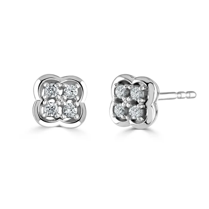Discover the allure of our 18ct white gold stud earrings, beautifully crafted in a distinctive quatrefoil shape. Each earring is set with four claw-set round brilliant cut diamonds, providing a total diamond weight of 0.14ct. The diamonds are graded H in colour and SI in clarity, ensuring a bright and clear sparkle that catches the light with every turn. These elegant earrings come equipped with secure post and butterfly fittings, offering both comfort and durability. Perfect for adding a sophisticated touch to any outfit, these diamond stud earrings are a must-have for those who appreciate luxurious style and exquisite craftsmanship. Enhance your jewellery collection with these stunning white gold and diamond earrings, ideal for both special occasions and everyday elegance.