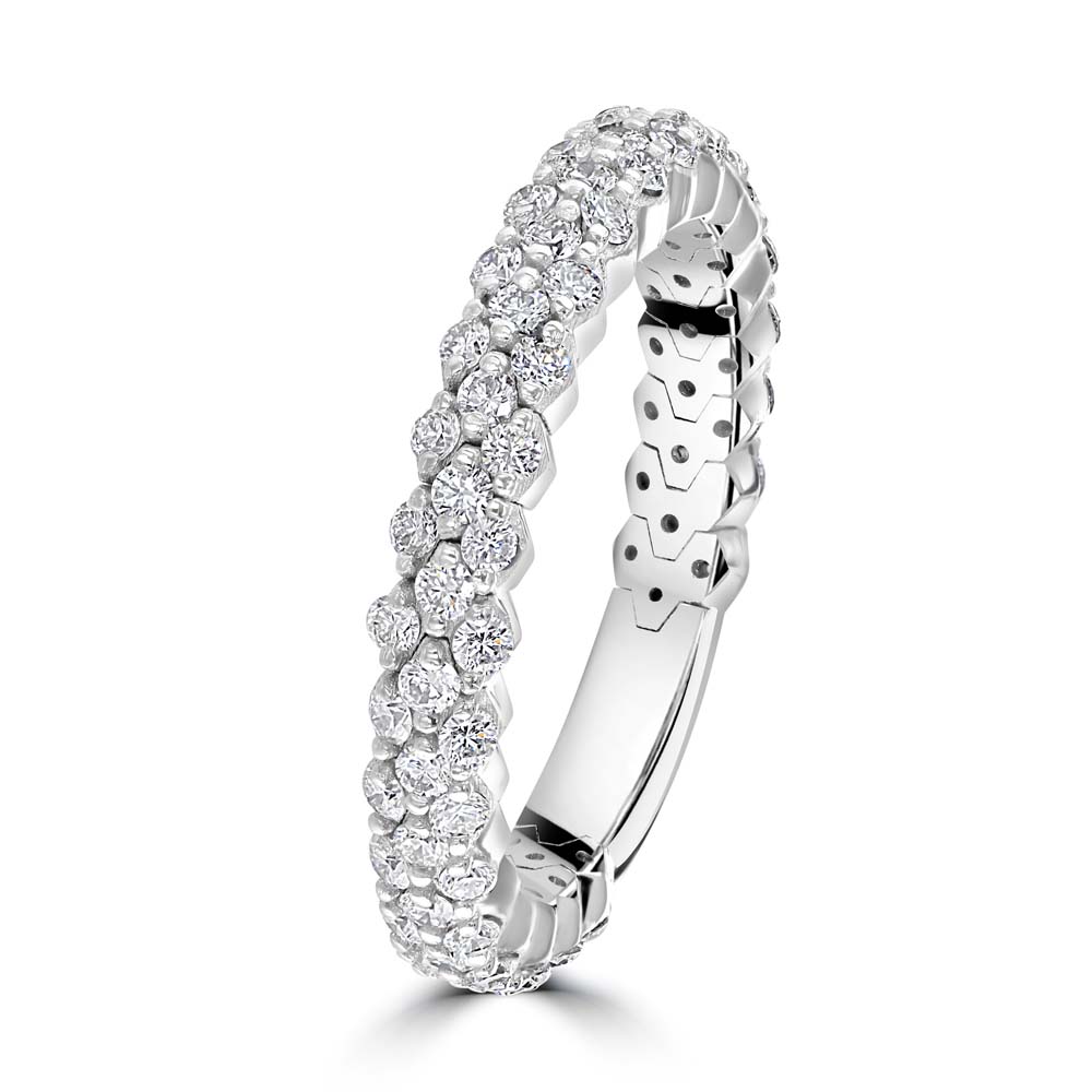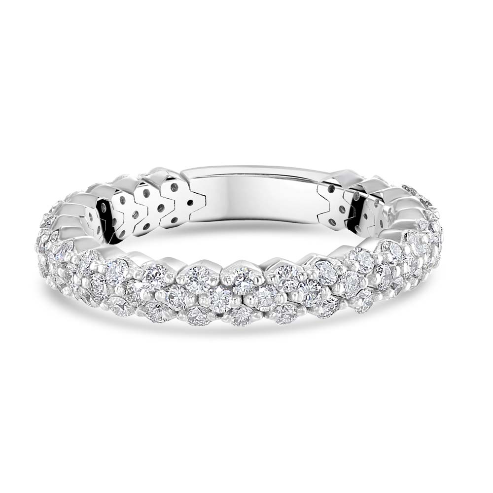 Immerse yourself in timeless luxury with this 18ct white gold eternity ring, exquisitely designed with 72 round brilliant cut diamonds claw-set across three elegant rows. With a total diamond weight of 1.01ct, each stone is meticulously selected for its G colour and SI clarity, offering exceptional sparkle and refined brilliance. The ring’s slightly flexible design ensures a comfortable fit while maintaining its structural integrity, making it ideal for everyday elegance or special occasions. The triple-row setting creates a dazzling display of light, symbolising eternal love and commitment. Perfect as a diamond anniversary ring, a luxury stacking piece, or a statement band, this eternity ring is a celebration of craftsmanship, sophistication, and enduring beauty.