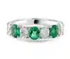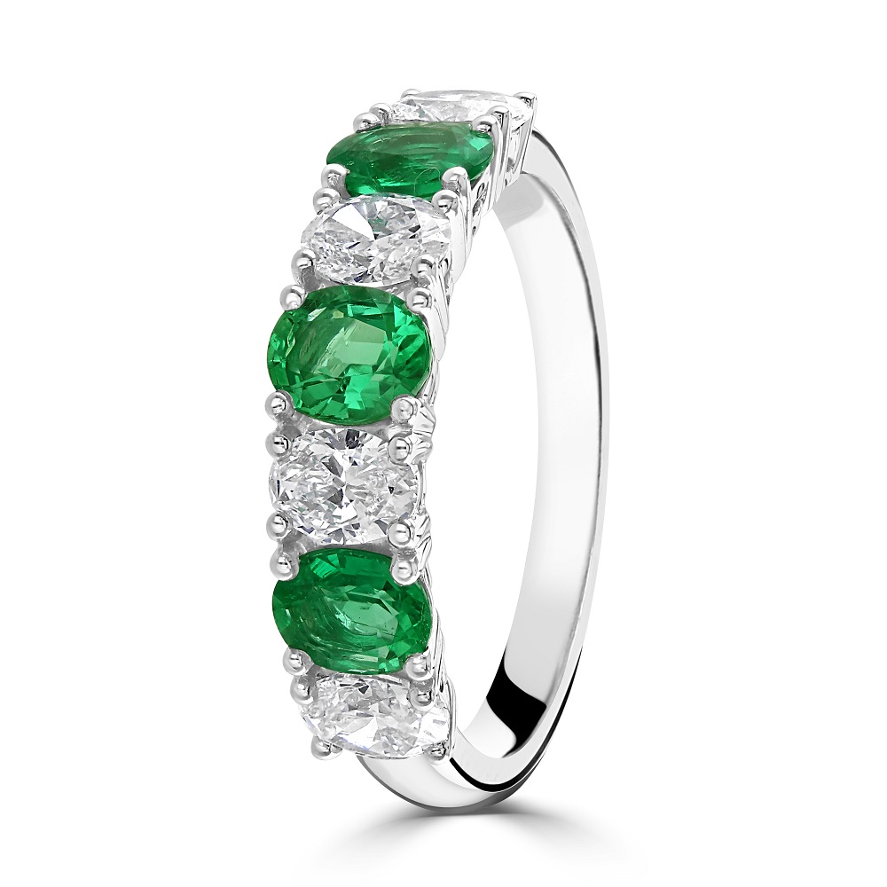 A luxurious 18ct white gold eternity ring. This stunning ring features a beautifully alternating sequence of four oval cut emeralds and three oval cut diamonds, each gemstone meticulously claw-set to showcase its unique brilliance and colour. With a total emerald weight of 0.90ct, these vibrant green stones symbolize renewal and growth, while the diamonds, weighing in at a total of 0.92ct, offer a dazzling contrast with their unmatched clarity and sparkle.