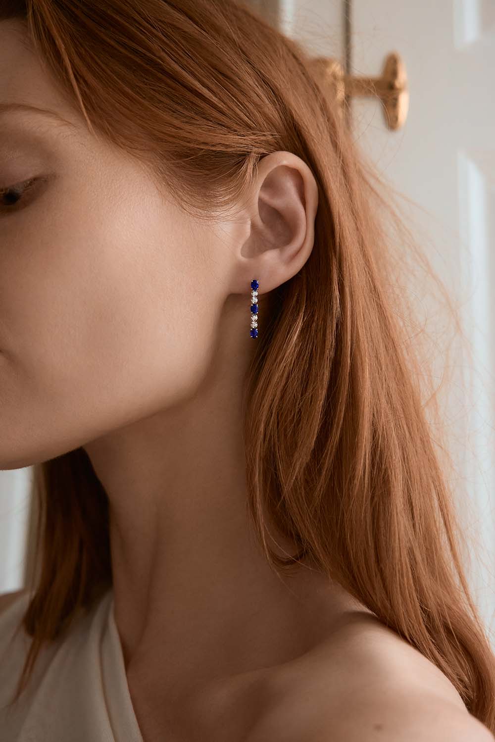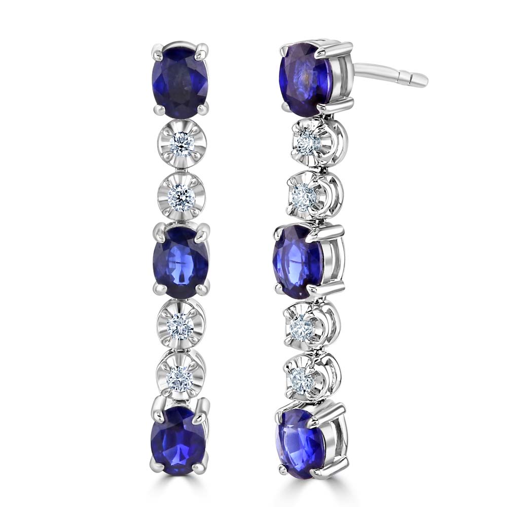 These sophisticated line drop earrings are beautifully crafted in 18ct white gold, featuring a graceful design that exudes elegance. Each earring showcases a series of claw set oval cut sapphires, known for their deep and enchanting blue hue. These sapphires are elegantly alternated with pairs of round brilliant cut diamonds, adding a sparkling contrast to the rich colour of the sapphires. The earrings are completed with post and butterfly fittings, ensuring a secure and comfortable wear.