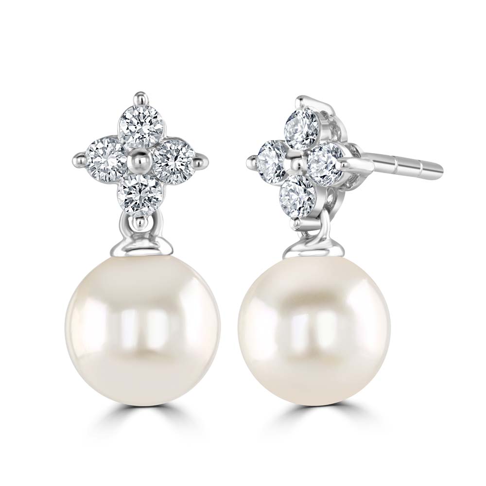 Discover the refined elegance of our 18ct white gold drop stud earrings, a stunning addition to any luxury jewellery collection. Each earring features a lustrous Akoya cultured pearl gracefully suspended beneath a delicately crafted flower composed of four claw-set round brilliant-cut diamonds. The flawless arrangement highlights the natural beauty and shimmer of both the pearls and the diamonds, creating a sophisticated and timeless piece. The Akoya pearls, known for their exceptional quality and impressive size ranging from 8.0 to 8.5mm in diameter, exude a classic elegance that is beautifully complemented by the sparkle of the diamonds, which have a total weight of 0.40 carats. The 18ct white gold setting enhances the brilliance of the diamonds and adds a modern touch to these exquisite earrings. Equipped with secure post and butterfly fittings, these earrings ensure comfort and stability for all-day wear. Whether accessorizing for a special event or enhancing your daily wardrobe, these pearl and diamond drop stud earrings promise to offer a touch of sophistication and luxury that will captivate and charm on every occasion.