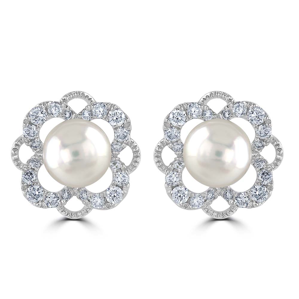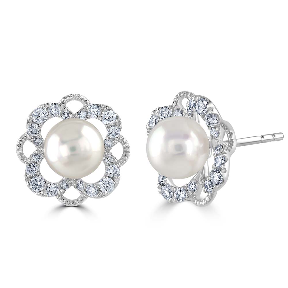 A pair of sophisticated white gold stud earrings. Each earring centres around a lustrous Akoya cultured pearl, measuring between 6.5 and 7.0mm in diameter, renowned for its deep, radiant lustre and round shape. These pearls are a symbol of elegance and purity, making these earrings an ideal choice for both formal and everyday wear. Surrounding the pearls, a delicately crafted flower-shaped frame is embellished with graduated round brilliant cut diamonds, totalling 0.44 carats. These diamonds are meticulously arranged to enhance the natural beauty of the pearls and to add a sparkling allure that catches the light beautifully. Equipped with post and butterfly fittings, these earrings offer both security and comfort, ensuring they remain a staple in your wardrobe for years to come. The classic white gold setting not only complements the cool tones of the pearls and diamonds but also adds a contemporary touch to the timeless design. Perfect for weddings, anniversaries, or as a thoughtful gift, these pearl and diamond stud earrings exude luxury and grace. They are sure to enchant and impress, becoming a cherished part of any jewellery lover’s collection.