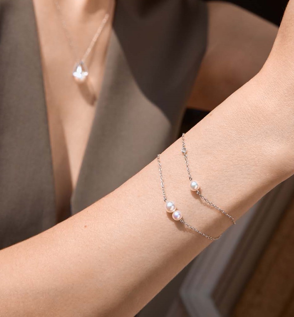 An elegant 18ct white gold Mikimoto chain bracelet, a symbol of refined taste and sophistication. This exquisite piece, showcases a single Akoya cultured pearl, celebrated for its unparalleled lustre and flawless round shape, with a diameter of 5.0mm. Adding a touch of brilliance to this elegant composition is a single round brilliant-cut diamond, securely set in a rub-over setting. The diamond, with a total weight of 0.02ct, sparkles with every movement, creating a captivating contrast against the pearl's serene beauty. Crafted from the finest 18ct white gold, this bracelet measures 18cm in length, offering a perfect fit that gracefully adorns your wrist. The delicate balance of the luminescent pearl and the radiant diamond on this slender chain embodies the essence of Mikimoto's legacy—creating jewellery that transcends time with its elegance and beauty.