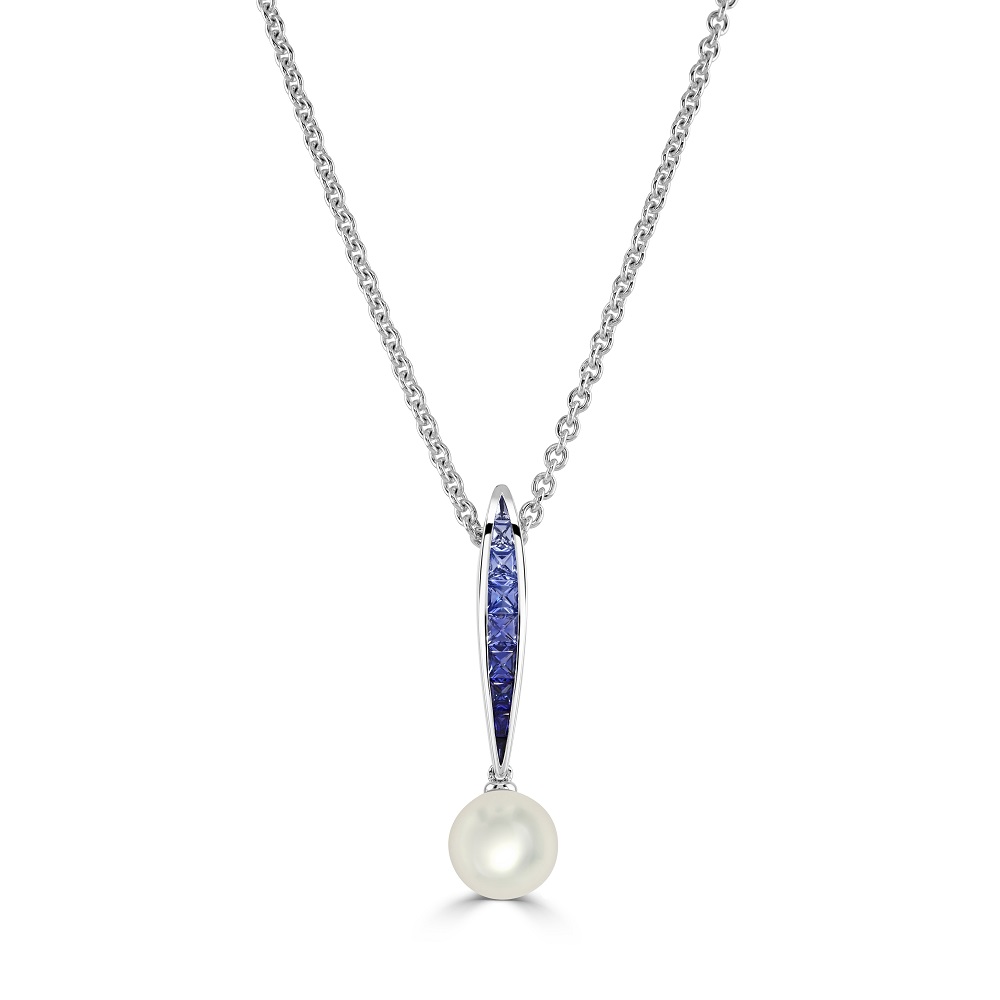 18ct White Gold Akoya Cultured Pearl and Sapphire Ocean Pendant