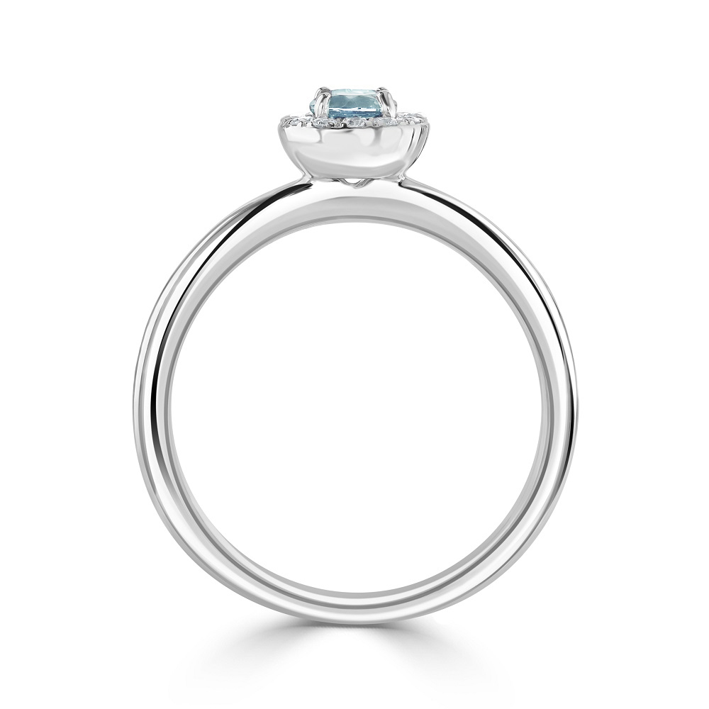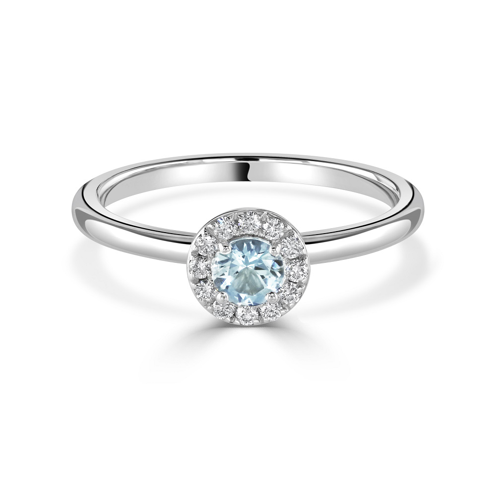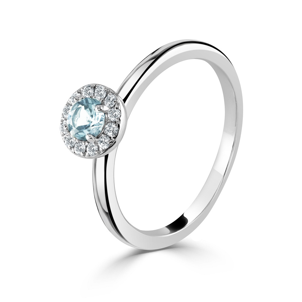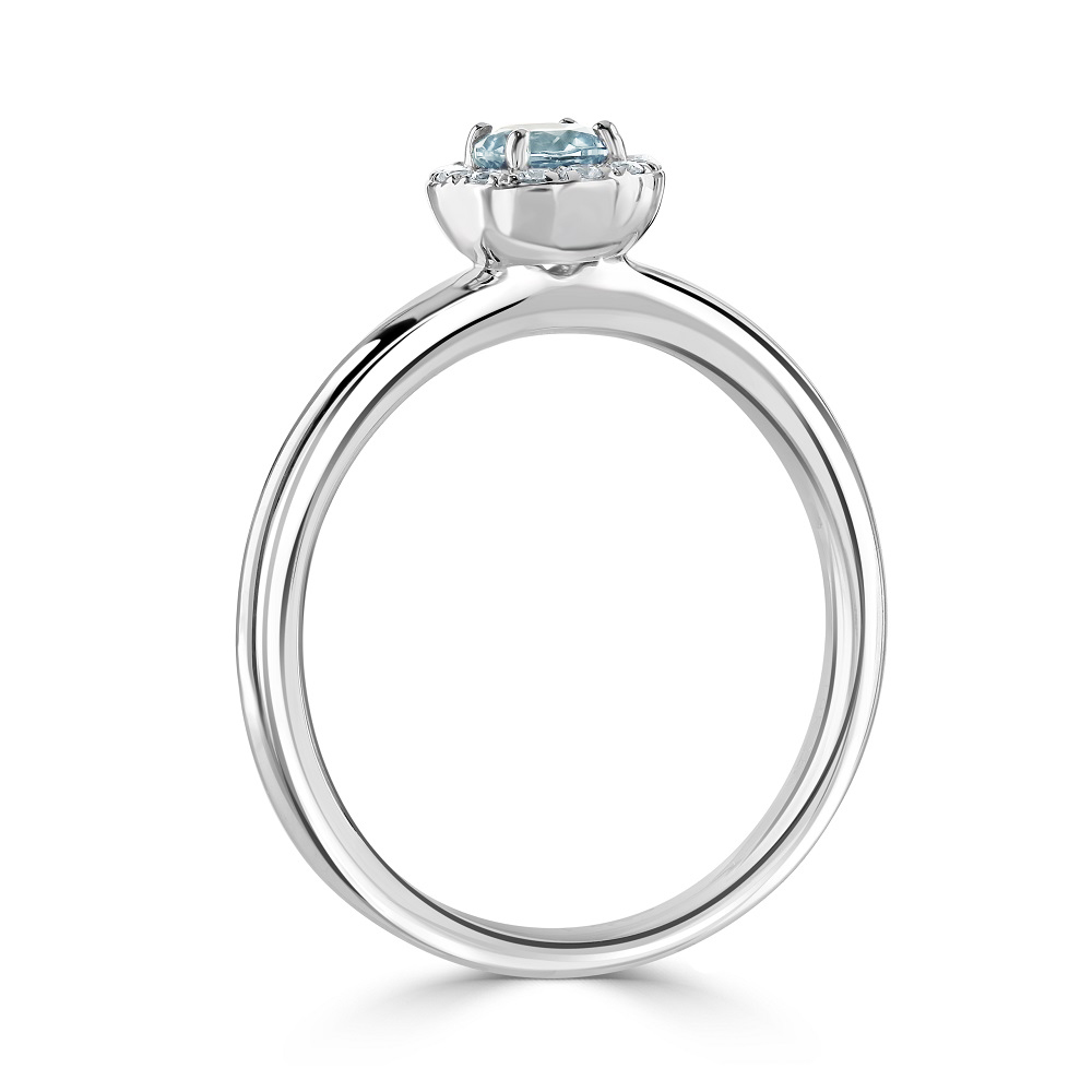 Discover the timeless beauty of our 18ct white gold halo ring, featuring a stunning round aquamarine as its centrepiece. This captivating aquamarine, weighing 0.23 carats, is securely set in a classic four-claw setting, showcasing its serene blue hue and exceptional clarity. Surrounding the aquamarine are twelve round brilliant cut diamonds, creating a dazzling halo that adds a touch of brilliance and sophistication. The total diamond weight is 0.10 carats, ensuring a harmonious blend of sparkle and elegance. Perfect for celebrating special occasions or adding a touch of luxury to your jewellery collection, this 18ct white gold halo ring combines exceptional craftsmanship with a timeless design. The sleek white gold band beautifully complements the vibrant aquamarine and the radiant diamonds, creating a piece that symbolizes enduring love and elegance.