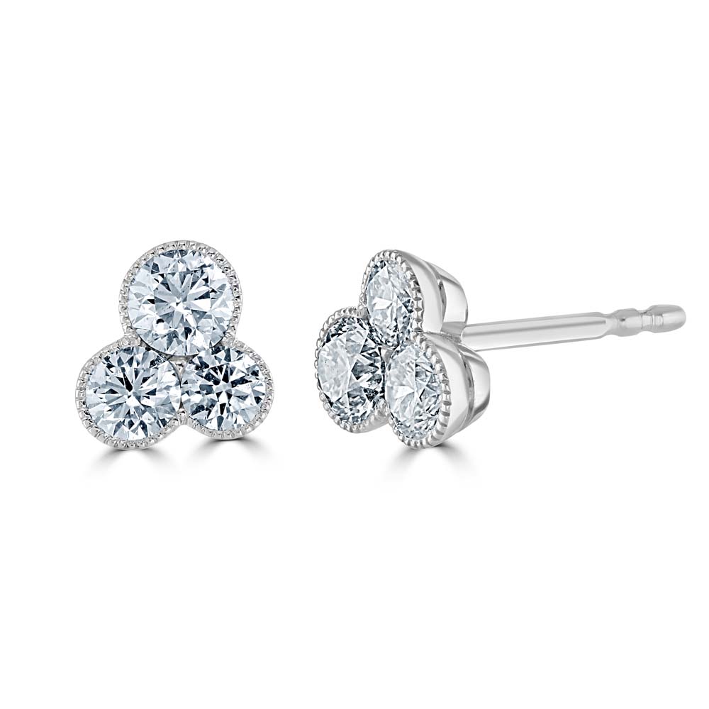 Elevate your style with our exquisite 18ct white gold asymmetrical trefoil stud earrings, each beautifully adorned with three sparkling round brilliant cut diamonds. Set in elegant millgrain-edged settings, these diamonds add a touch of vintage charm and sophisticated sparkle to the modern design.
