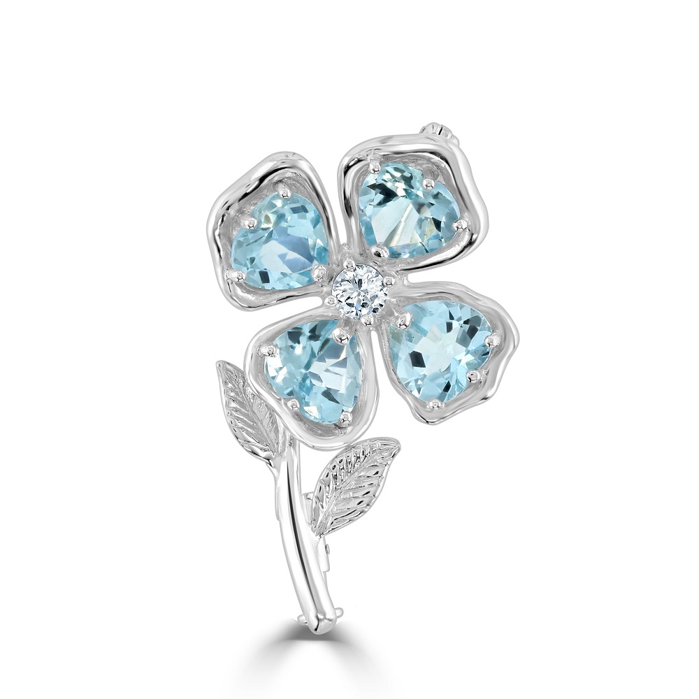 An elegant 18ct white gold flower brooch, a masterpiece of jewellery design, featuring delicate petals crafted from the finest Blue Topaz, totalling 5.93ct, and centered with a dazzling round brilliant cut diamond weighing 0.25ct. This stunning brooch captures the essence of elegance and beauty, with each Blue Topaz petal exuding a serene blue hue, reminiscent of clear skies and tranquil waters. At the heart of this floral arrangement lies a radiant diamond, meticulously cut to maximize its brilliance and sparkle, embodying the brooch's luxurious appeal. Crafted in lustrous 18ct white gold, this brooch combines the timeless beauty of nature with the sophistication of fine gemstones, making it a perfect accessory for those who appreciate the finer things in life. Whether adorning a scarf, lapel, or hat, this flower brooch adds a touch of glamour and refinement, making it a must-have addition to any jewellery collection. Celebrate the allure of Blue Topaz and the brilliance of diamonds with this captivating flower brooch.