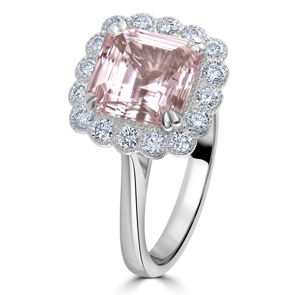 Elevate your jewellery collection with our stunning 18ct white gold cluster ring, exquisitely designed to showcase a luxurious centre of step-cut pink morganite, weighing an impressive 2.31 carats. This captivating morganite is beautifully complemented by a halo of twelve round brilliant cut diamonds, each meticulously rubover set and finished with a delicate milgrain edge, totalling 0.32 carats. Crafted from premium 18ct white gold, this ring offers a sleek and sophisticated silhouette that enhances the natural beauty of the pink morganite and the sparkling diamonds. The milgrain edging adds a touch of vintage charm, creating a perfect blend of contemporary and classic styles. Ideal for those who appreciate elegance and a hint of romantic colour, this cluster ring is perfect for special occasions or as a standout addition to everyday wear. It makes a magnificent engagement ring or a thoughtful gift, symbolizing love and commitment with its alluring pink hue and dazzling diamond frame.