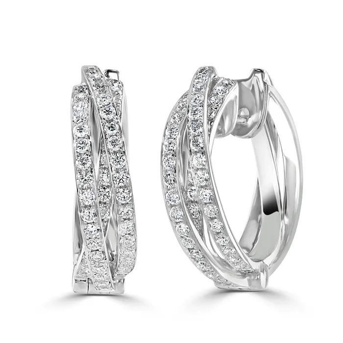 Enhance your jewellery collection with our stunning 18ct white gold hinged hoop earrings, crafted with exceptional elegance and a contemporary twist on the classic wedding ring style. These luxurious earrings feature three intricately intertwined strands, each adorned with sparkling diamonds, culminating in a total diamond weight of 0.94 carats. The hinged design ensures a secure and comfortable fit, perfect for daily wear or special occasions. Crafted from premium 18ct white gold, these hoop earrings offer a sleek and polished finish that complements any look. Ideal for those seeking a sophisticated blend of modern style and timeless elegance, these diamond-set earrings are sure to be a treasured addition to any fine jewellery collection.